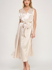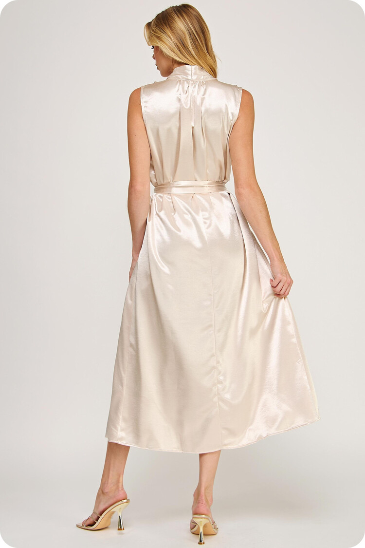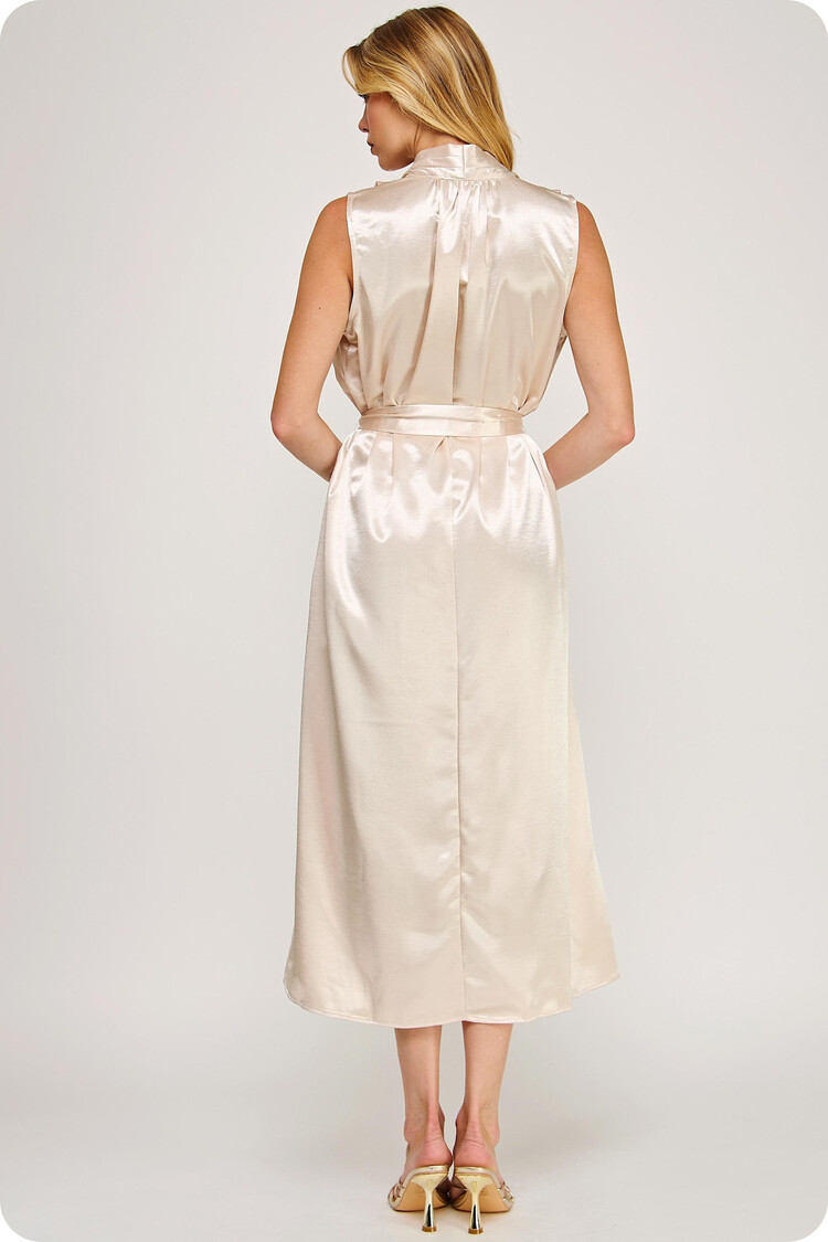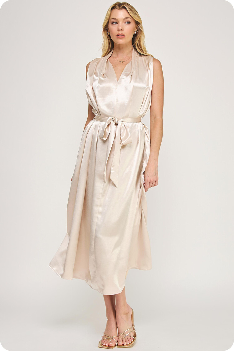 Draped V neckline long dress in texture hammered satin fabric. This sleeveless trapeze midi dress features a relaxed fit, removable sash waist tie, a draped V-neck, side pockets, and pleat detail at back neck.