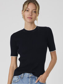 The Mozza Short Sleeve Sweater is an essential separate for all-seasons styling. A flattering slim fit, short sleeve, rib knit, and contrasting hems creates a timeless wardrobe appeal.