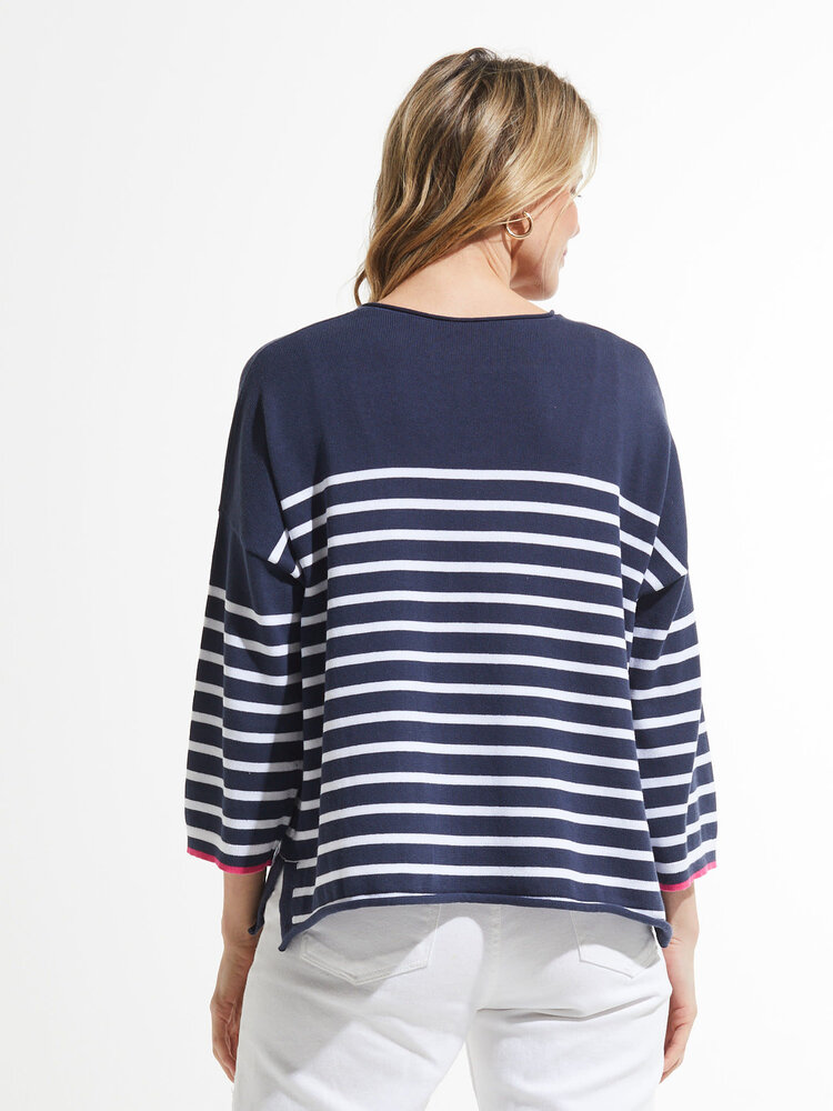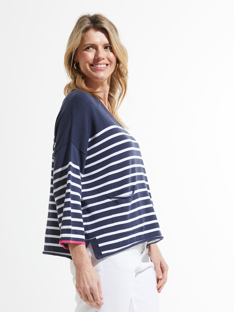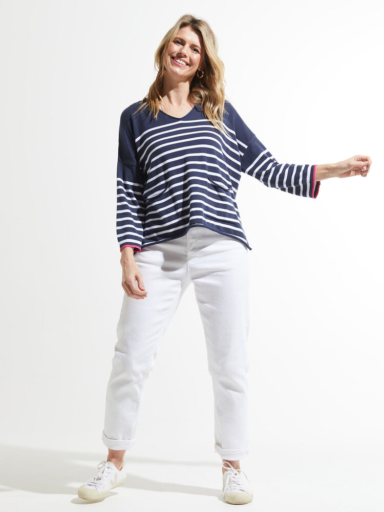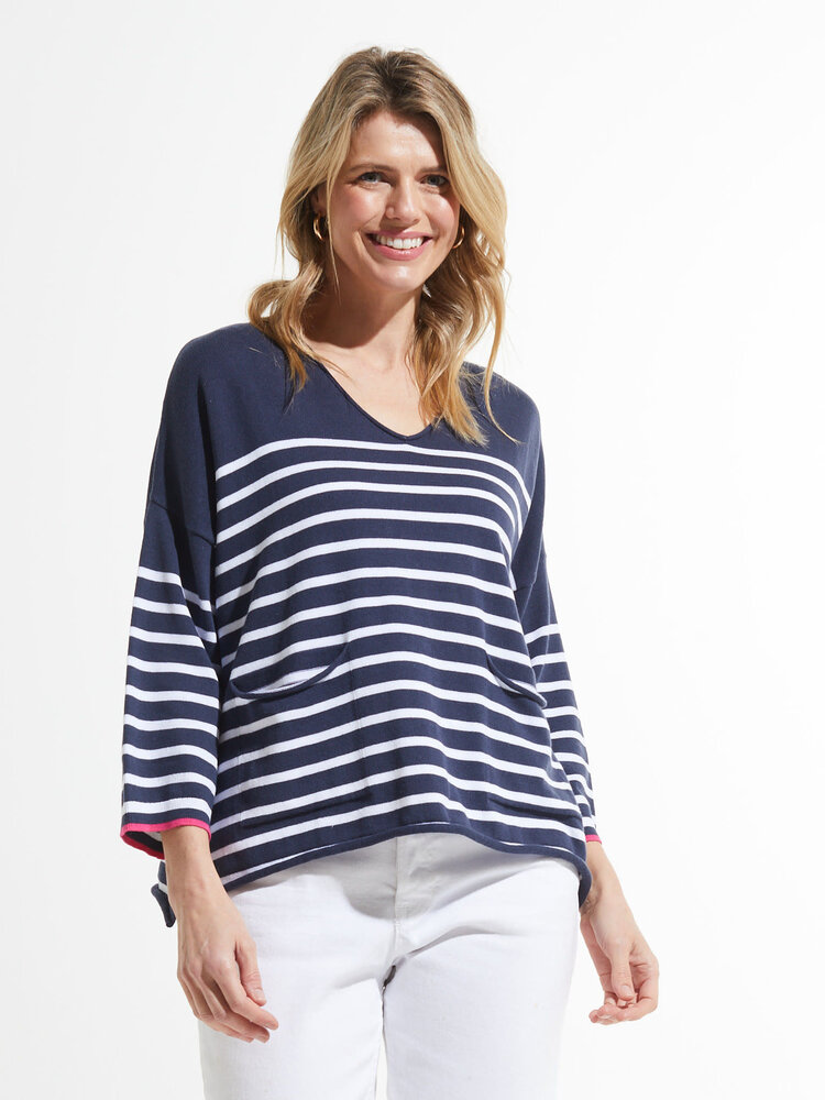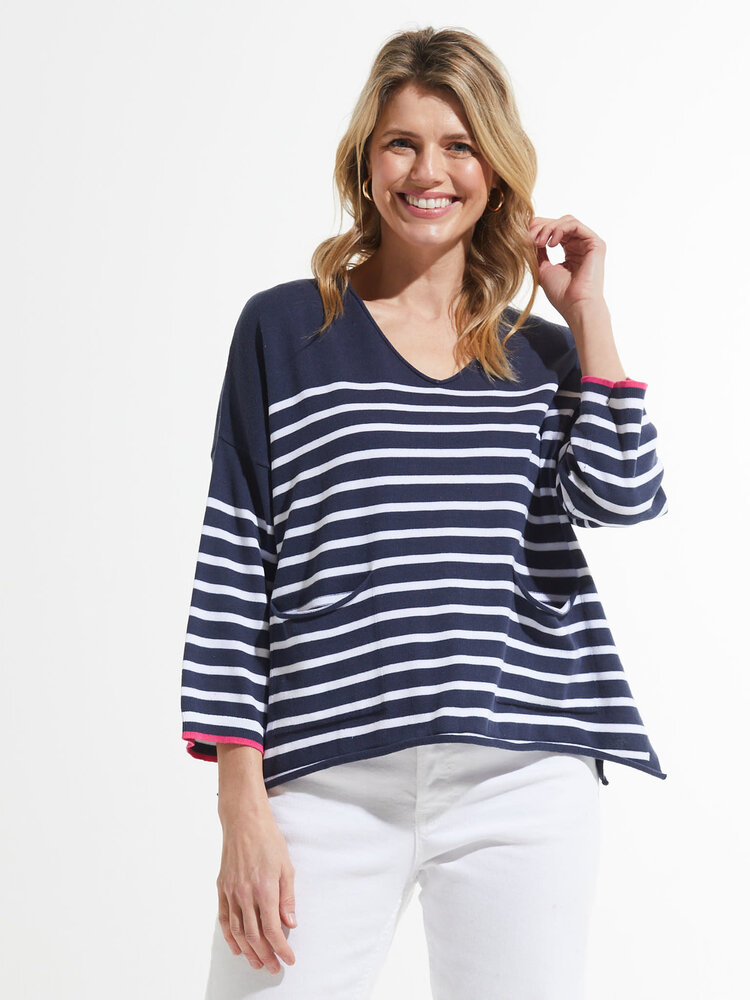 • Crafted with 100% cotton, this V-neck sweater features stylish side slits and a vibrant striped pattern. Contrasting colors on the wrists add a sophisticated touch, while two front pockets provide both style and functionality.