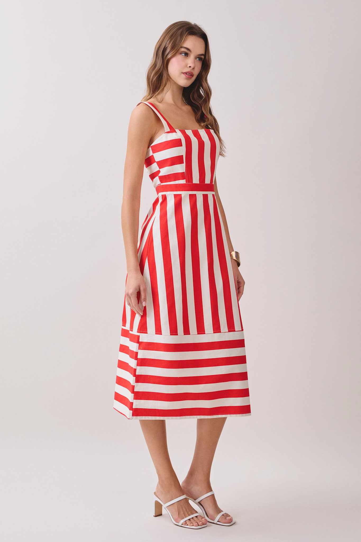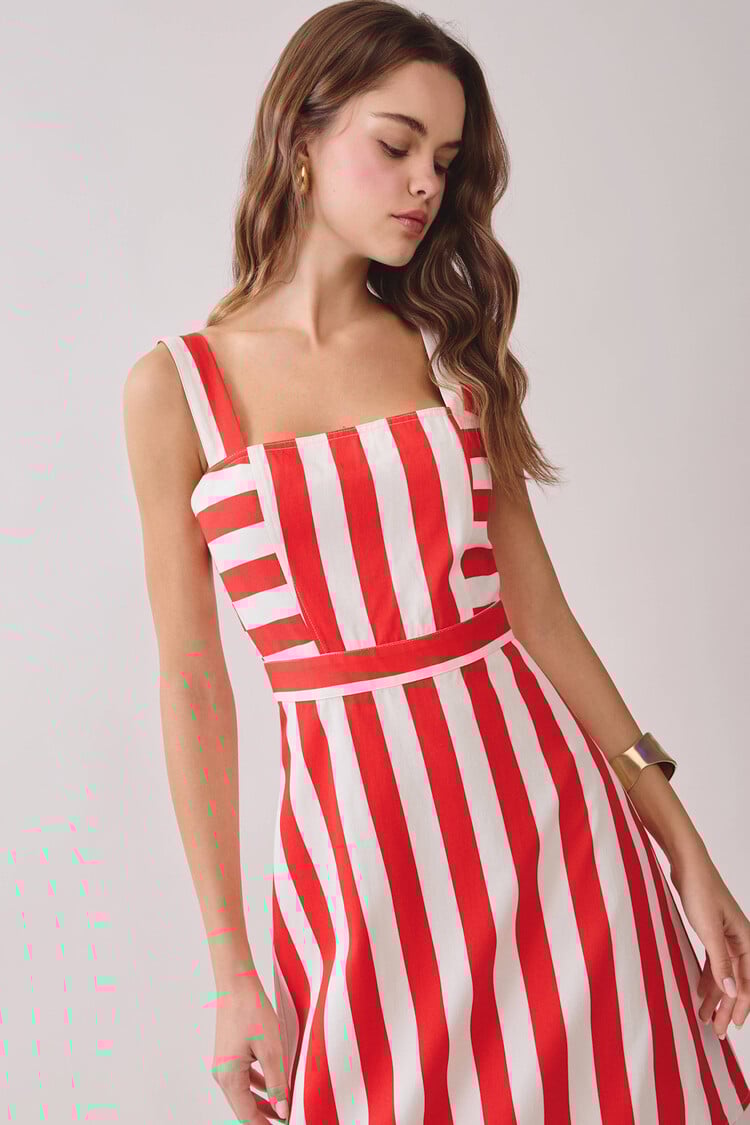 A striped midi dress featuring wide straps and a square neckline. Designed with alternating vertical and horizontal stripe panels for a bold look. The fitted bodice is finished with a back zipper closure. 100% cotton