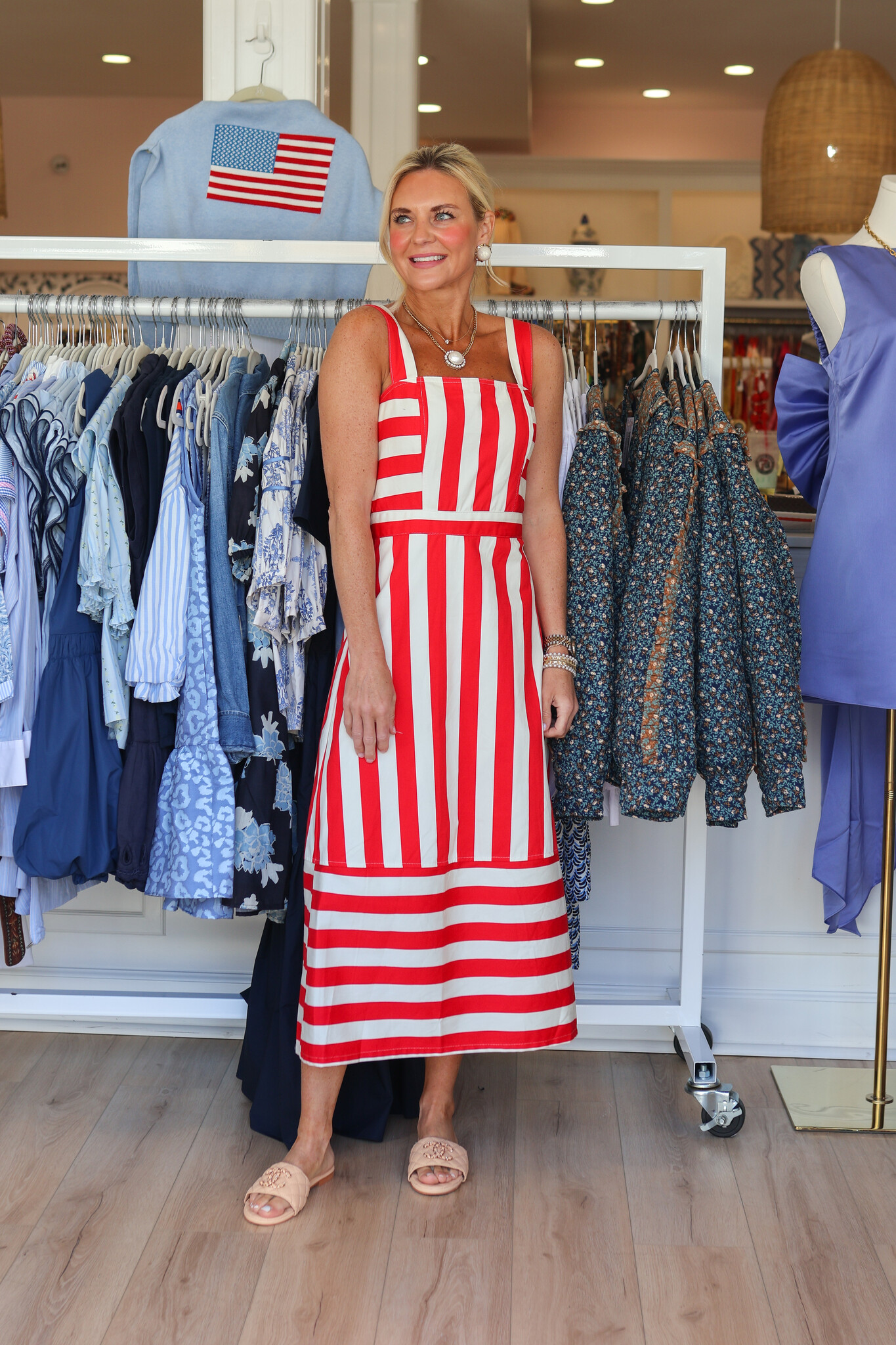 • A striped midi dress featuring wide straps and a square neckline. Designed with alternating vertical and horizontal stripe panels for a bold look. The fitted bodice is finished with a back zipper closure. 100% cotton