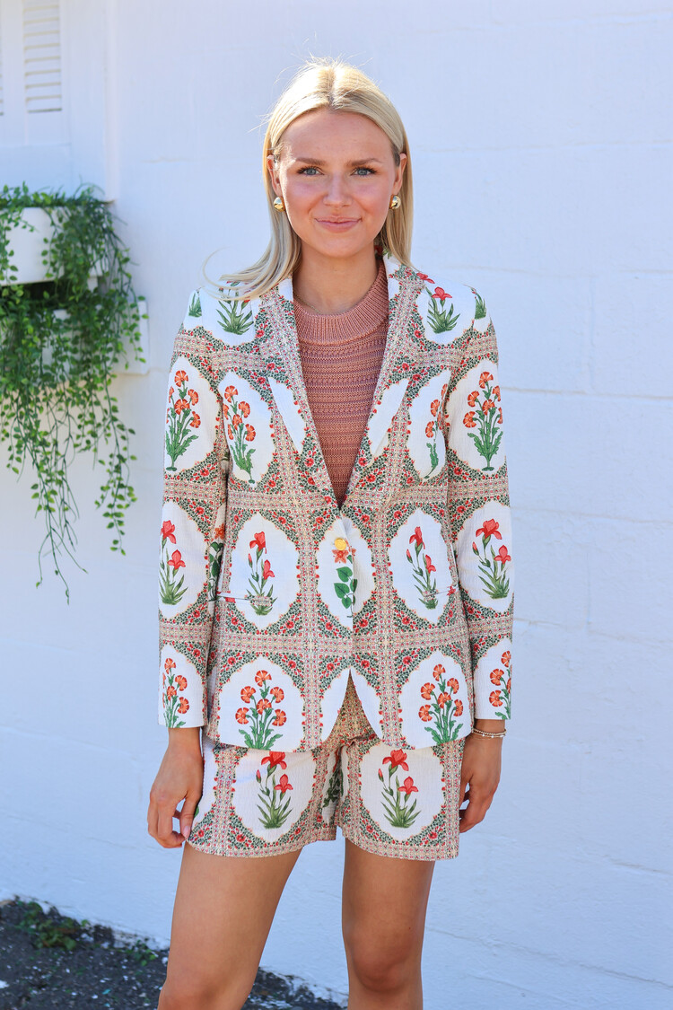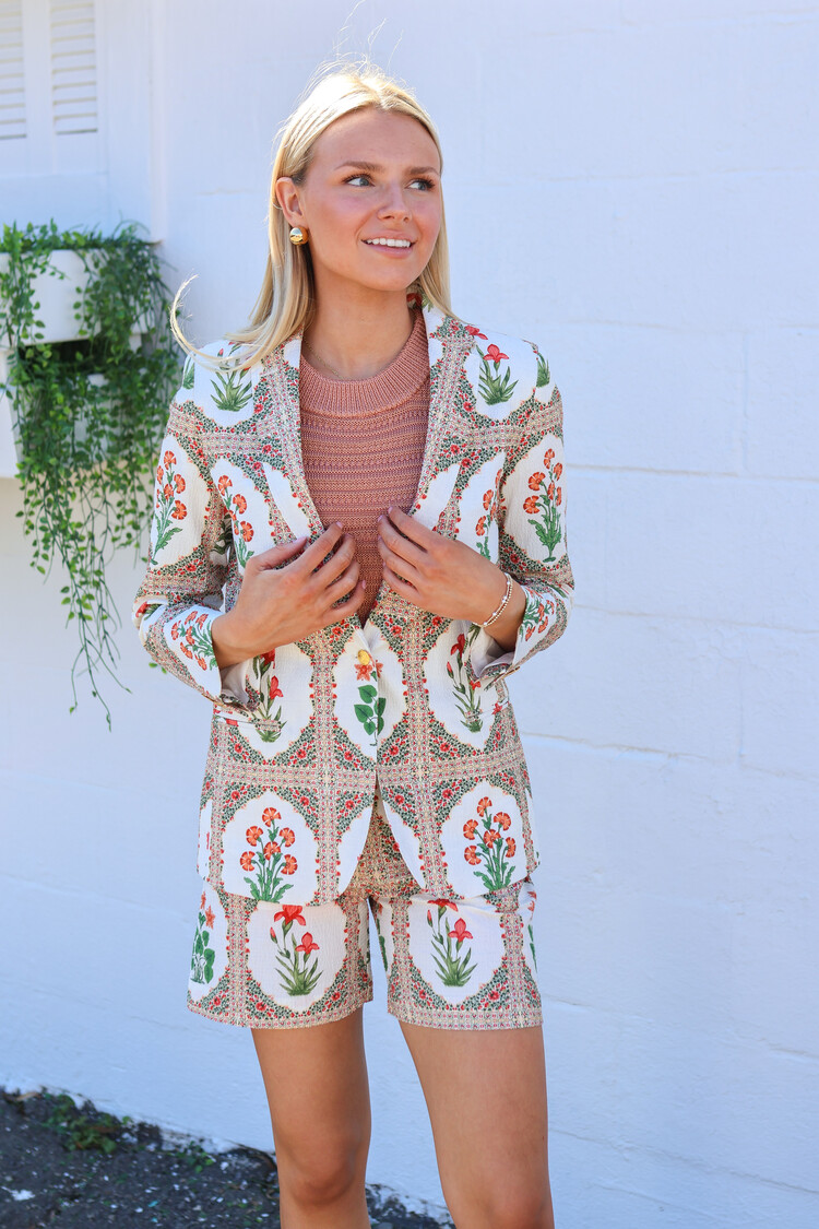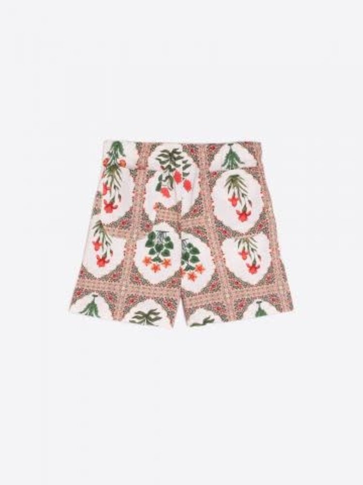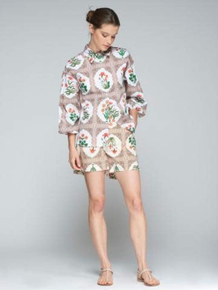• shorts in crinkle effect fabric with flower print. Elastic at the back of the waist. Front and back pockets. Matching jacket available.