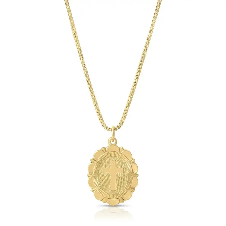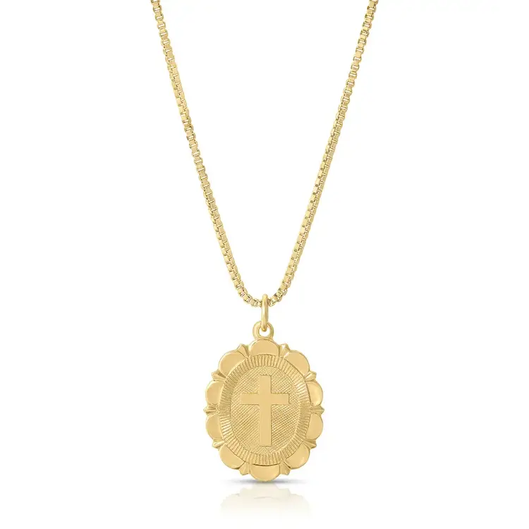 • Stunning gold filled cross charm is accented by a scalloped edge. 20mm x16mm Charm. 18" 1mm Rope Chain. Materials: Gold Filled
