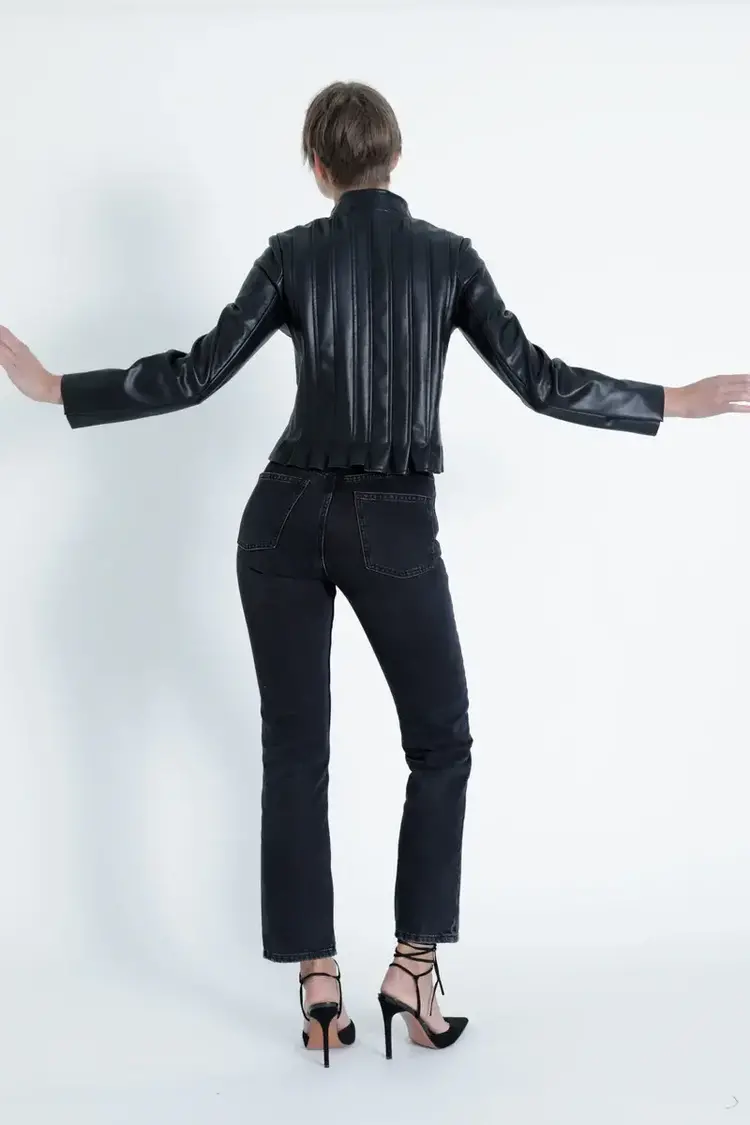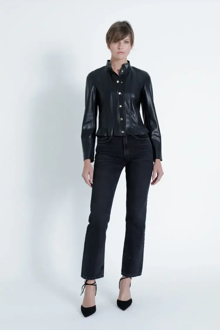 • Crafted from premium vegan leather, this jacket offers a chic and sustainable alternative to traditional leather. The high collar adds a touch of sophistication, while the snap button closure ensures a secure fit.