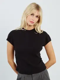 Studio Strut and Bolt Collection. Pearl jeweled trim top in stretch knit fabric. This knitted top features ribbed cap sleeve detail, pearl detail at round neckline, and a relaxed fit. The perfect versatile top to layer, dress it up or down.