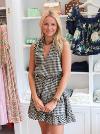 Feminine and playful, this gingham mini dress features a cinched drawstring waist with gold-tipped ties that allows for adjustability. The sleeveless silhouette is balanced by a flirty skirt and a ruffle-trimmed collar that adds a hint of vintage charm.