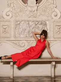 Feminine and playful, this gingham mini dress features a cinched drawstring waist with gold-tipped ties that allows for adjustability. The sleeveless silhouette is balanced by a flirty skirt and a ruffle-trimmed collar that adds a hint of vintage charm.
