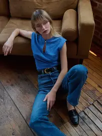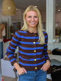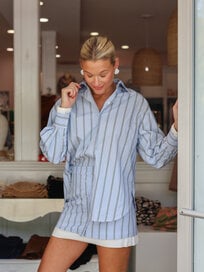 Navy and white check shirt with a classic pointed collar and front button fastening. The sleeves feature large structured double ruffles at the cuffs. Straight hem and crisp, firm cotton fabric that holds its shape. Regular fit and tailored silhouette.