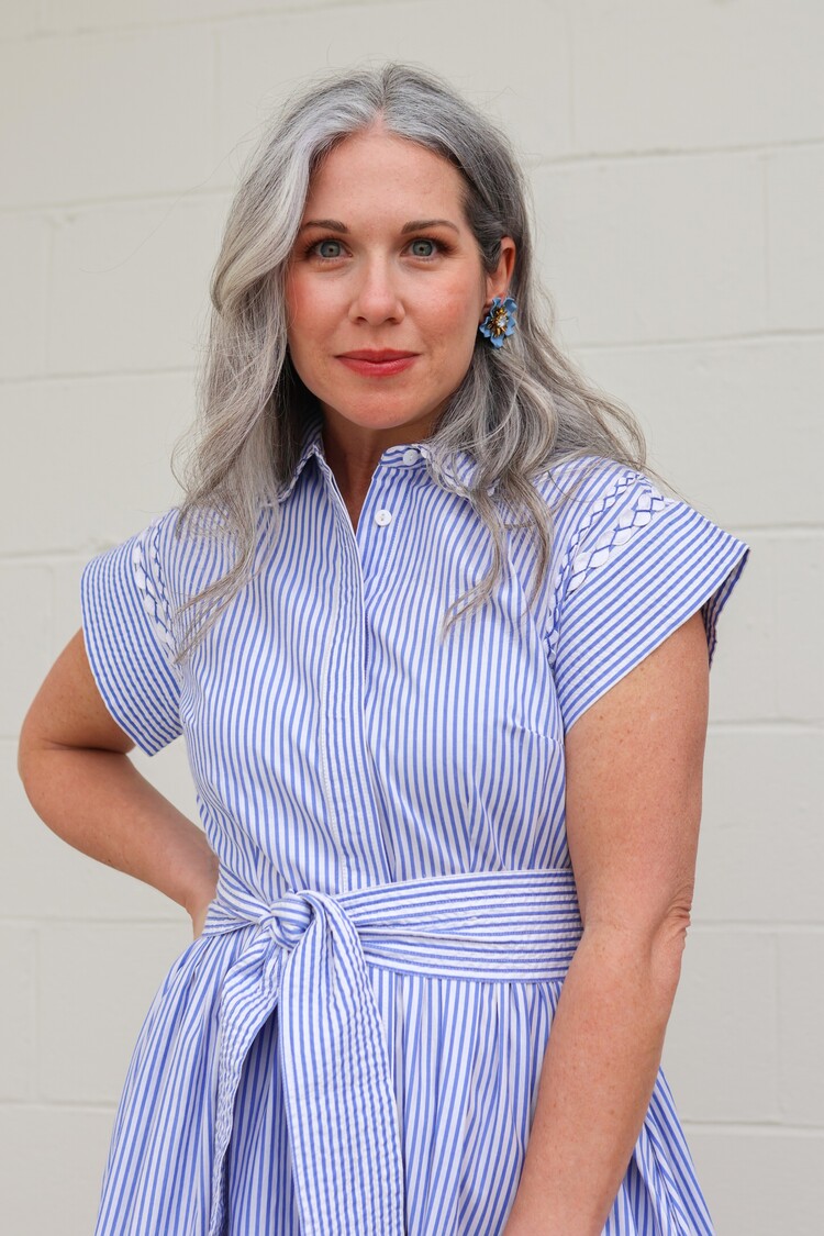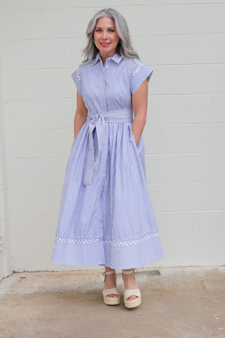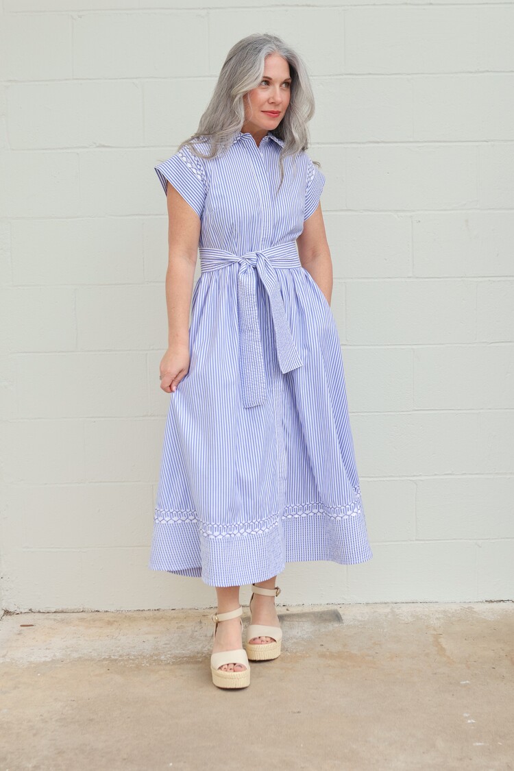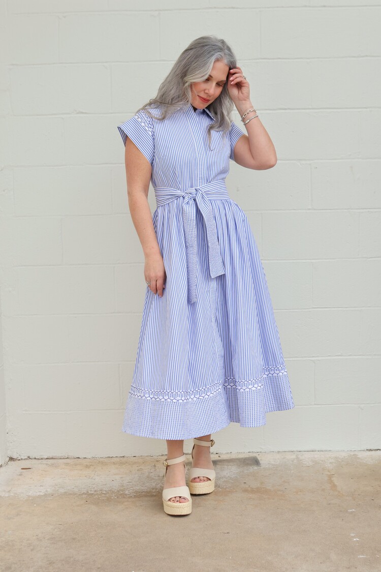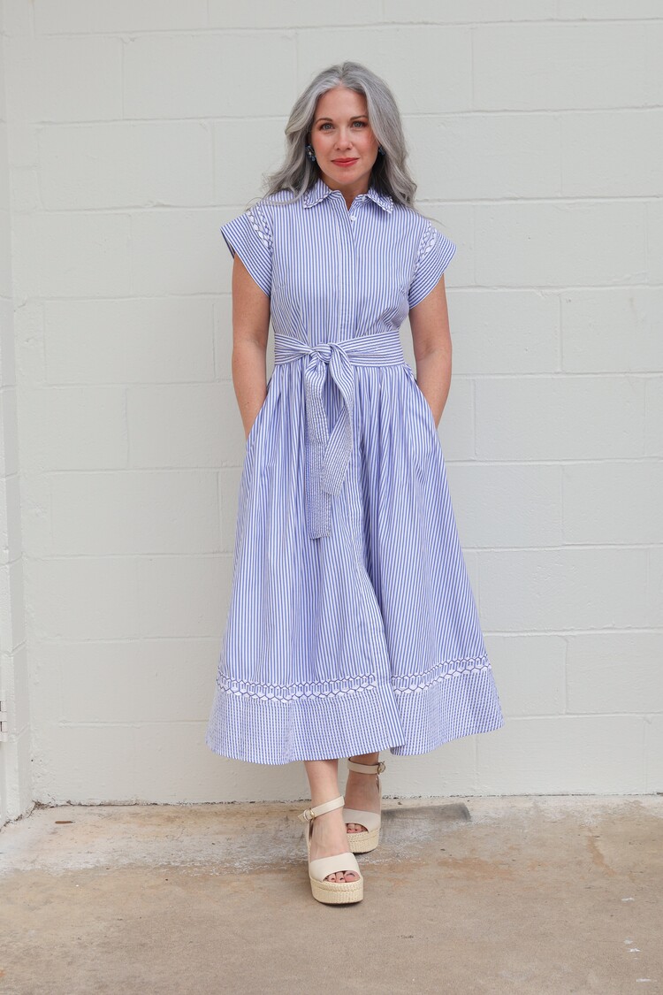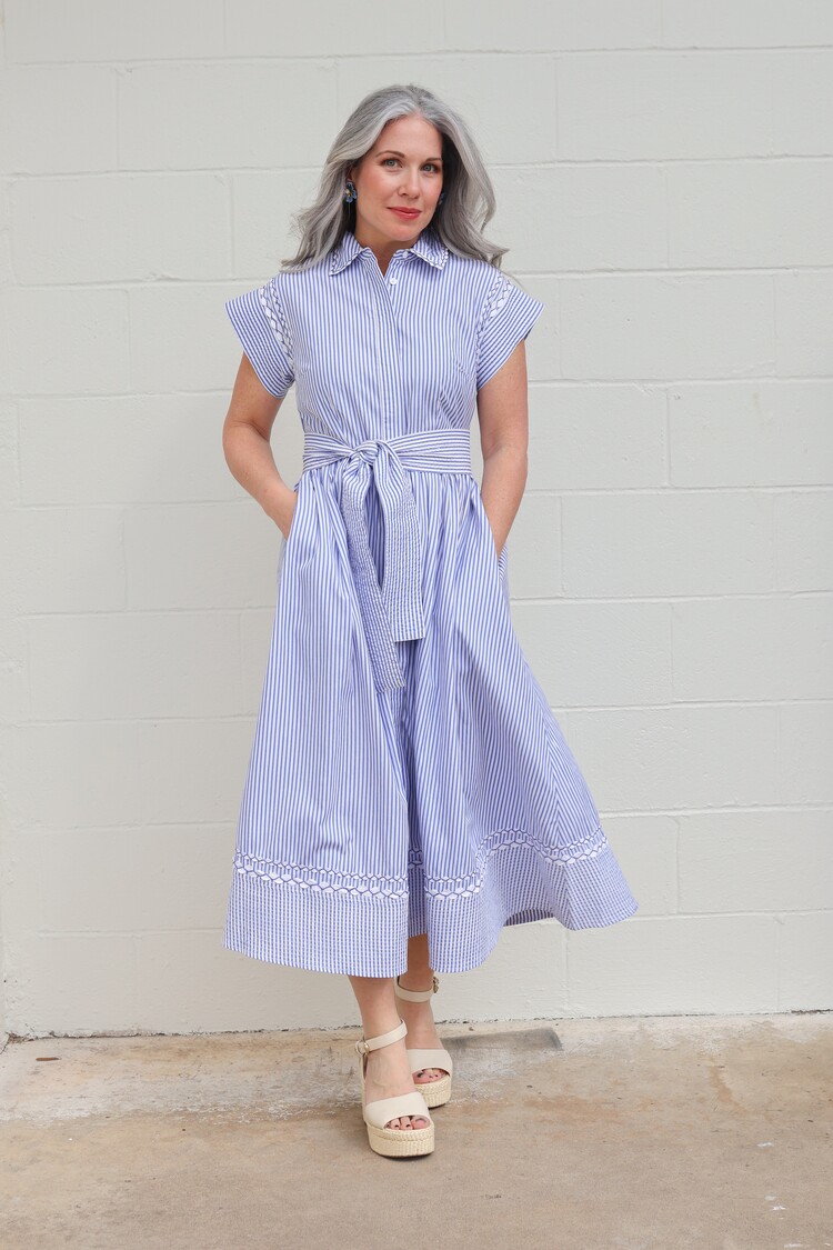 A nod to classic coastal charm, Sconset Blue brings a playful twist to our signature silhouette. Crafted from crisp pin-stripe cotton poplin, this dress is detailed with contrasting ric-rac accents that highlight its tailored lines.
