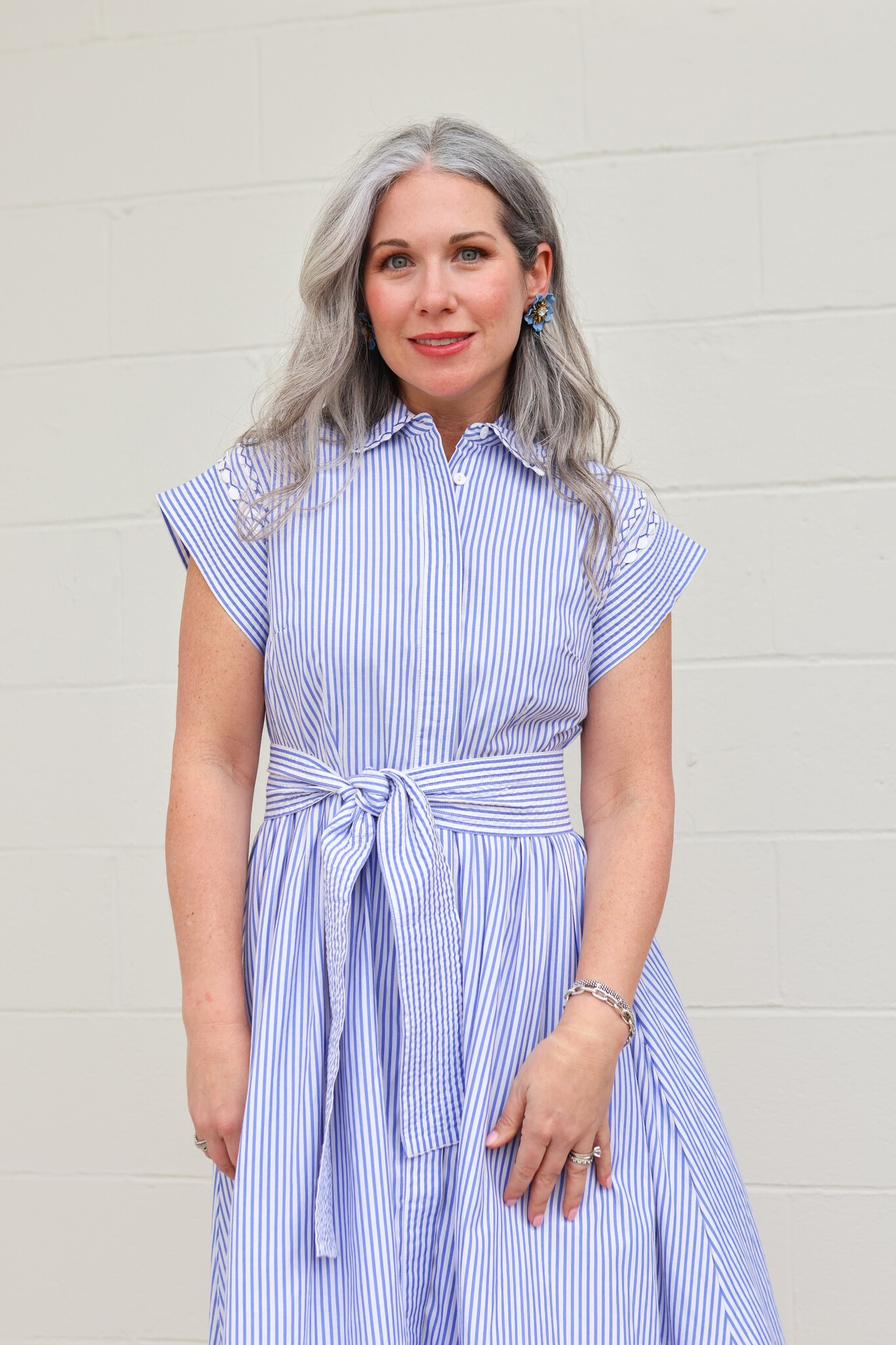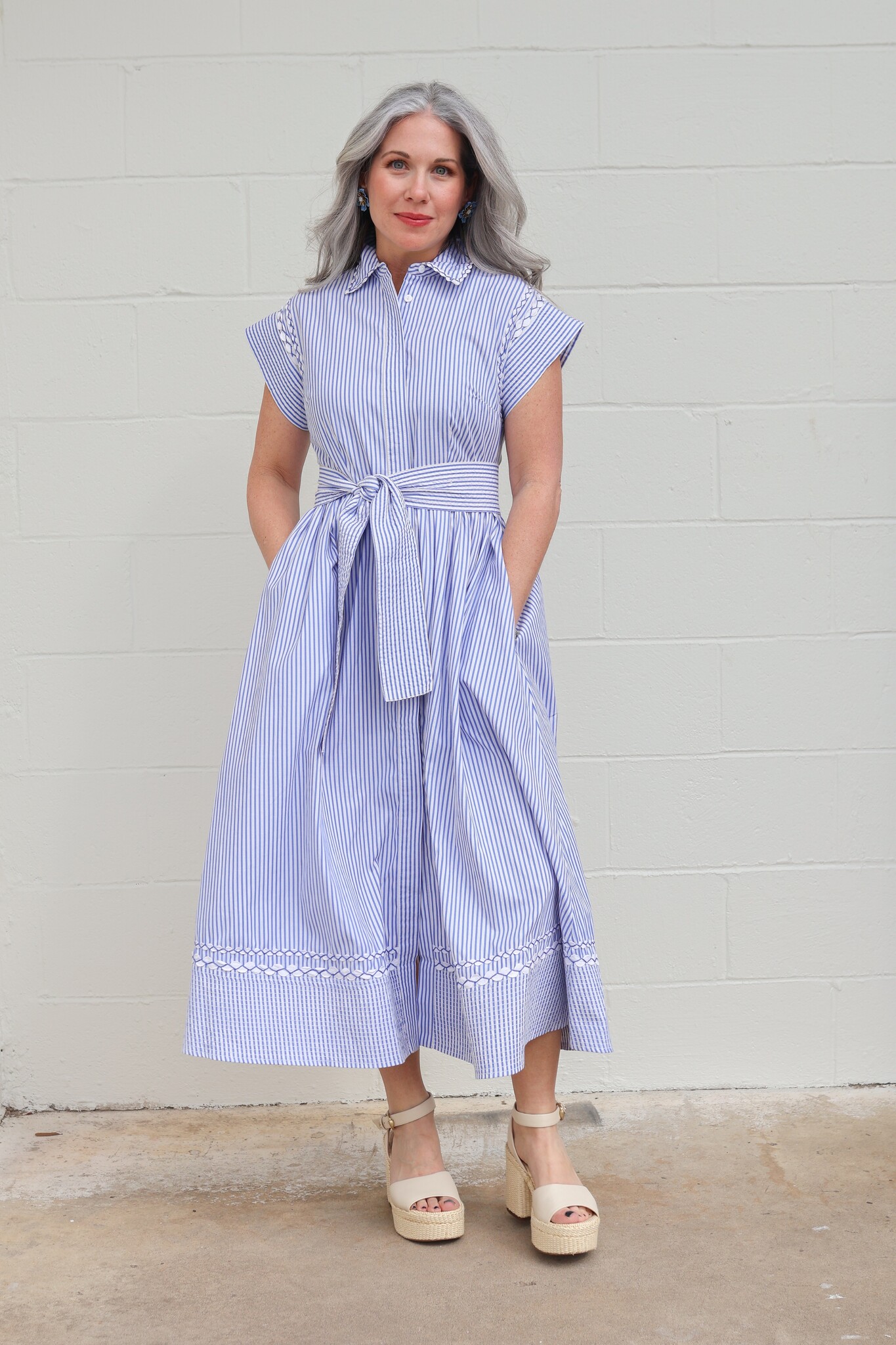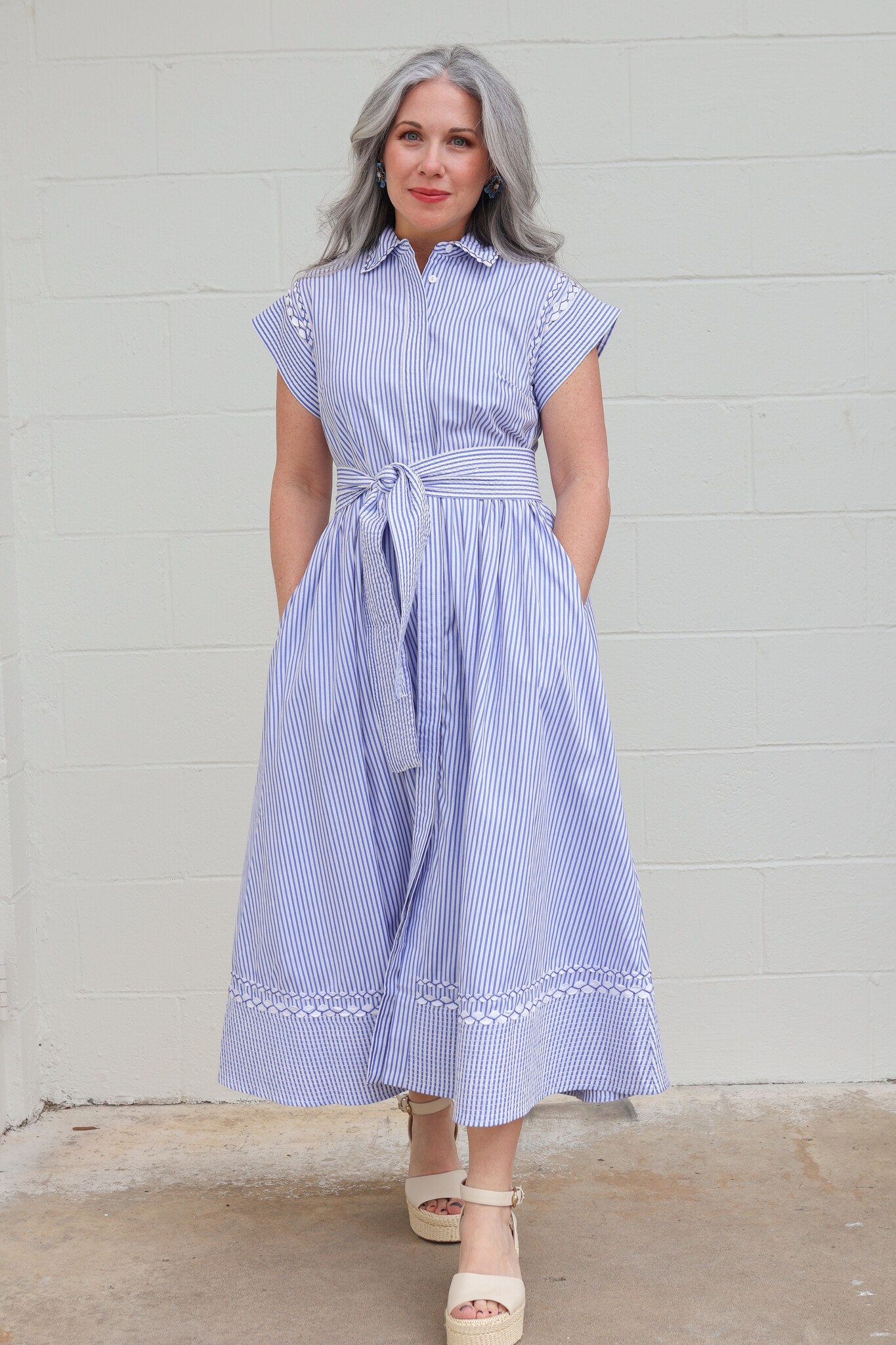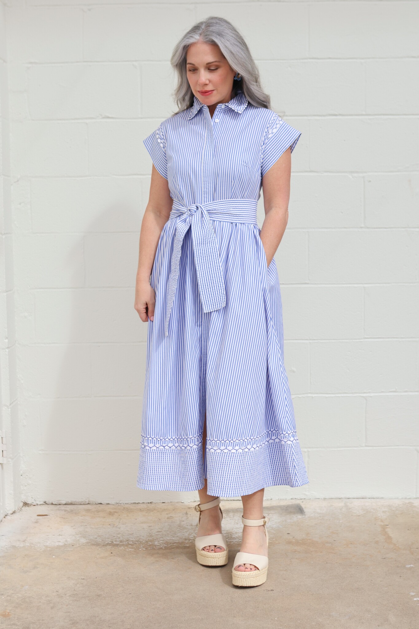 A nod to classic coastal charm, Sconset Blue brings a playful twist to our signature silhouette. Crafted from crisp pin-stripe cotton poplin, this dress is detailed with contrasting ric-rac accents that highlight its tailored lines.