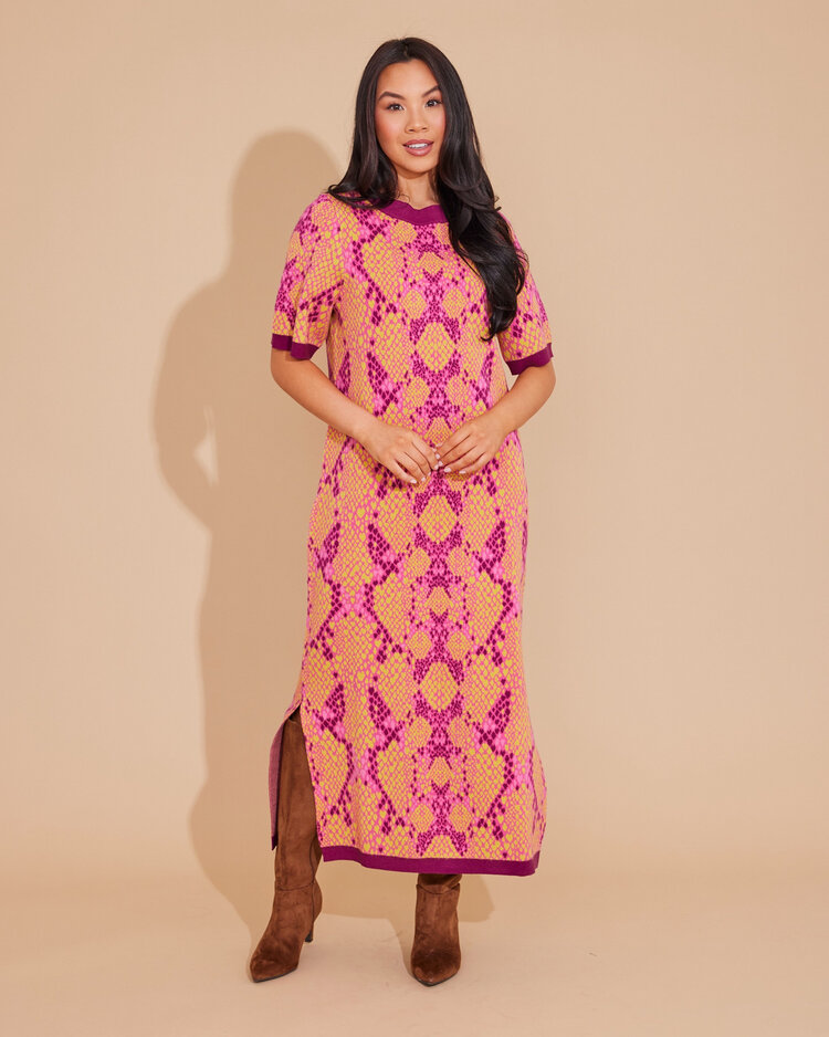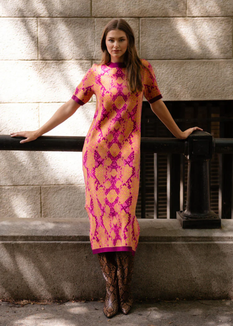 This cozy dress + fun print are the perfect addition to your fall wardrobe. The serpent print is nothing short of gorgeous + fun, and one of our favorite prints. Pair with a suede boot for gorgeous fall look!