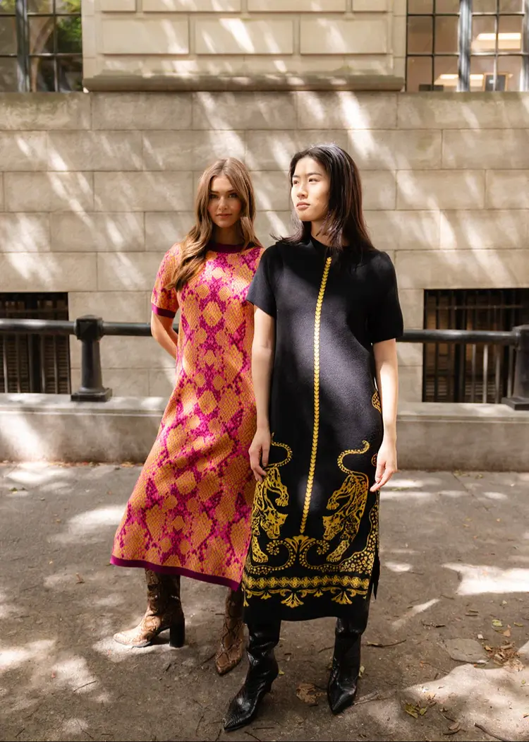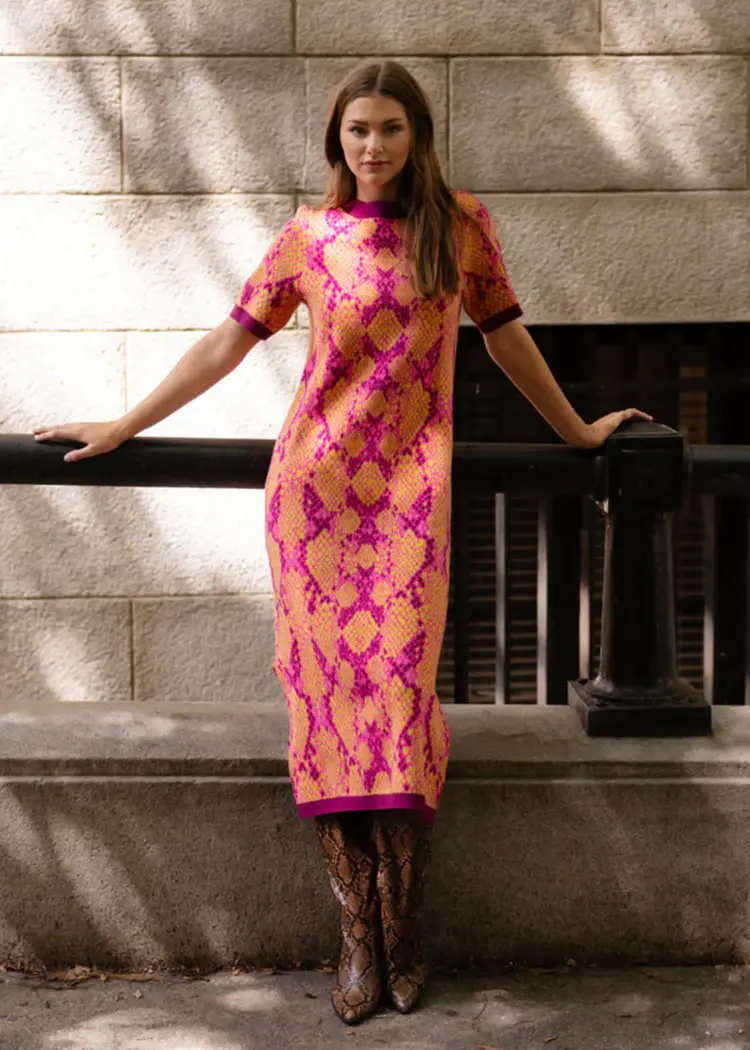 • This cozy dress + fun print are the perfect addition to your fall wardrobe. The serpent print is nothing short of gorgeous + fun, and one of our favorite prints. Pair with a suede boot for gorgeous fall look!