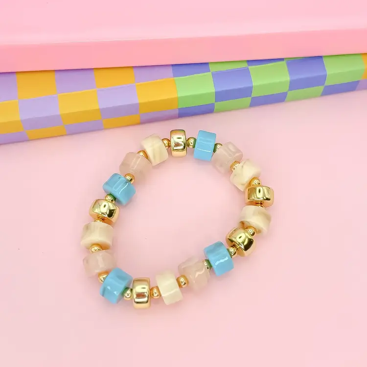 • The Seashell Gelato Bracelet is the perfect scoop of summer style — featuring soft pastel beads in peach, vanilla, and ocean blue, paired with luxe gold accents.