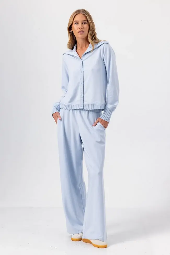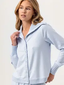 The silhouette is casual through the body and features an oversized fold-over collar for an effortless look. Intricate sweater rib accents. This piece is designed to be styled with the matching Selene Pant for a coordinated, elevated ensemble.