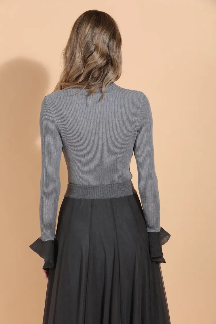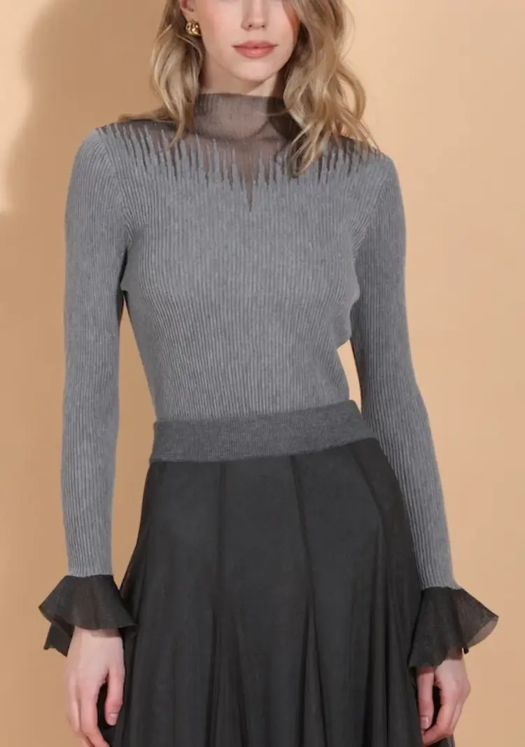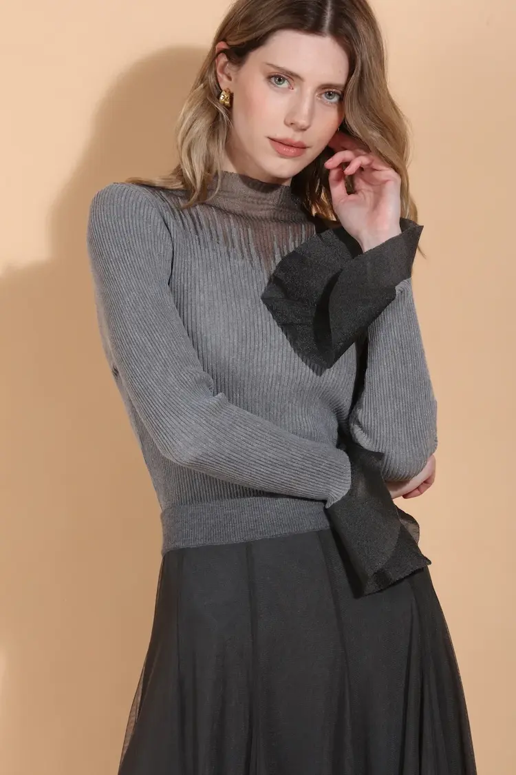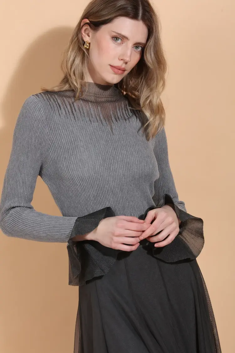 • Sheer Mock Neck Lightweight Knit Top With Peplum Cuff