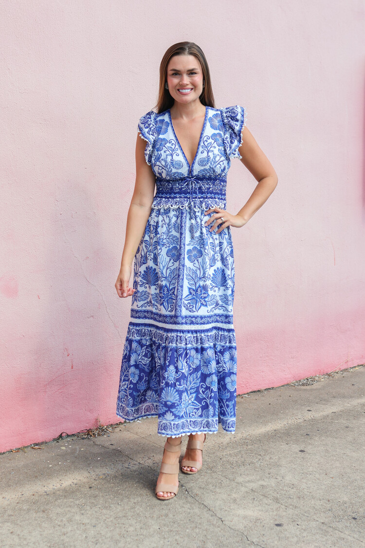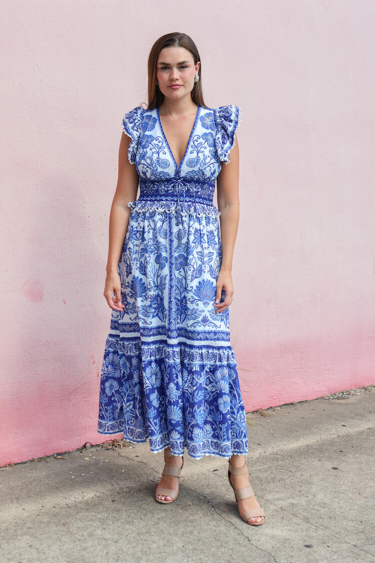 • This delightful piece showcases an enchanting blue botanical pattern against a gentle off-white backdrop. The V neckline adds a touch of grace, while playful ruffled cap sleeves and intricate smocking at the waist create a flattering silhouette.