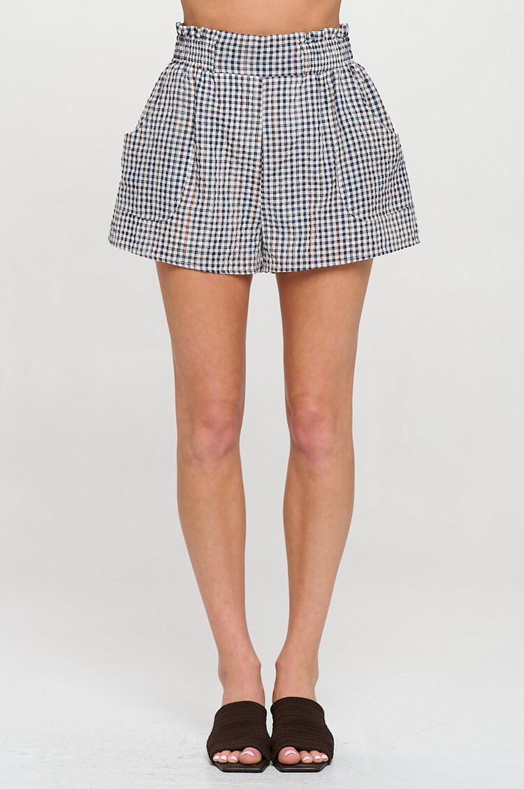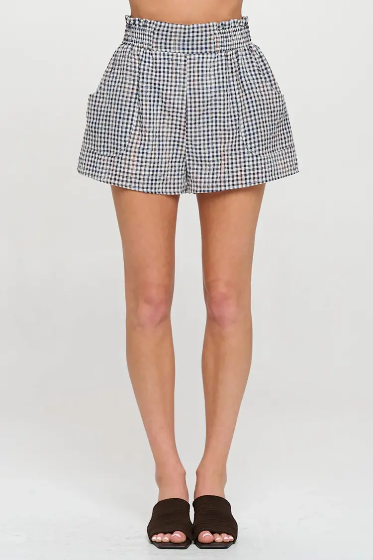 The Sienna Plaid Shorts offer a polished yet relaxed look. These lightweight plaid shorts feature a high-rise elastic waistband for a flattering fit, roomy front patch pockets, and a subtle pleated detail that adds soft volume.