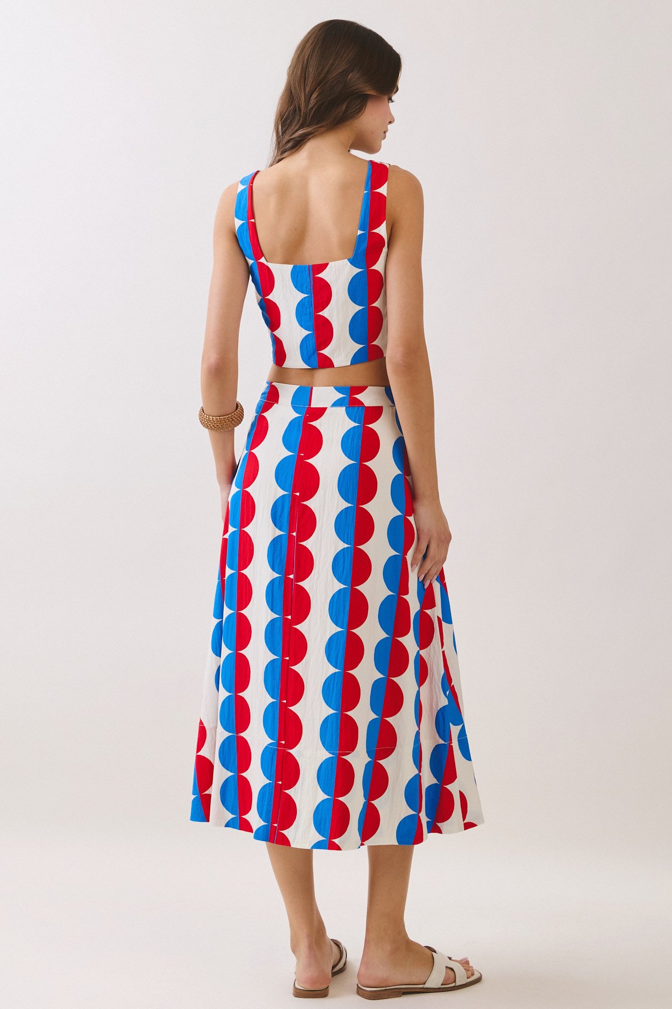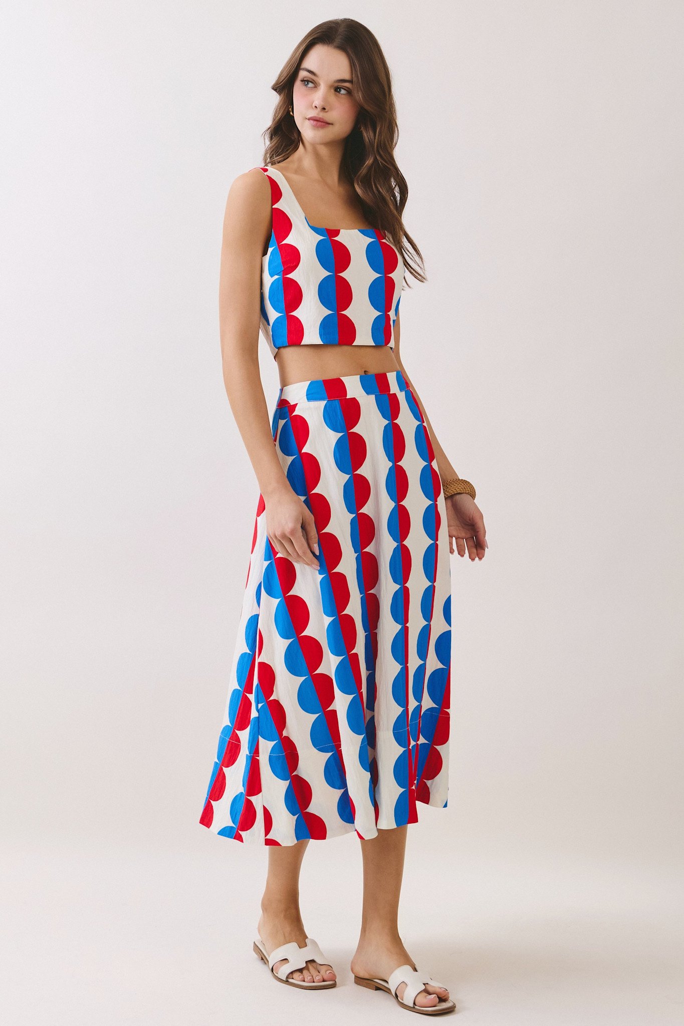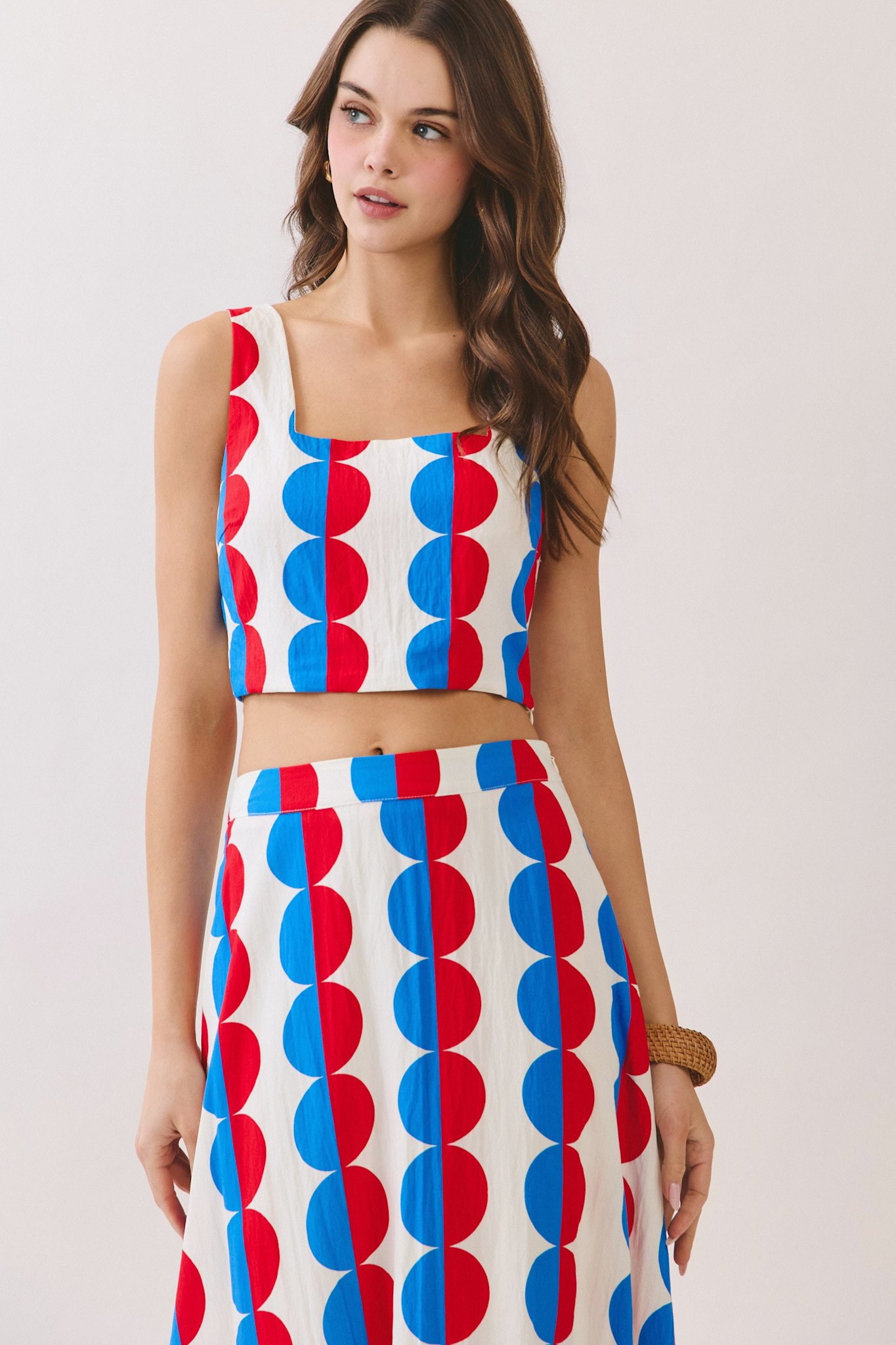 A printed two piece set featuring a sleeveless crop top with a square neckline, hidden side zipper and wide shoulder straps. Paired with a matching high-waisted midi skirt designed with a flattering A-line silhouette. Finished with a side zipper closure.