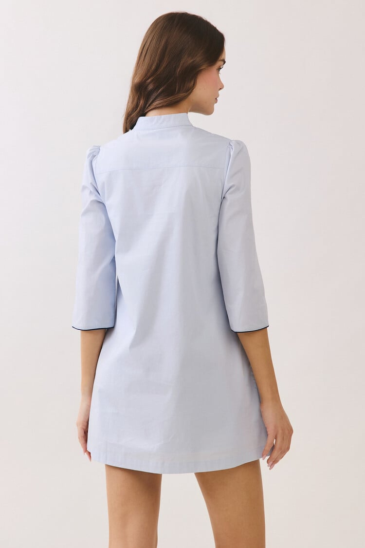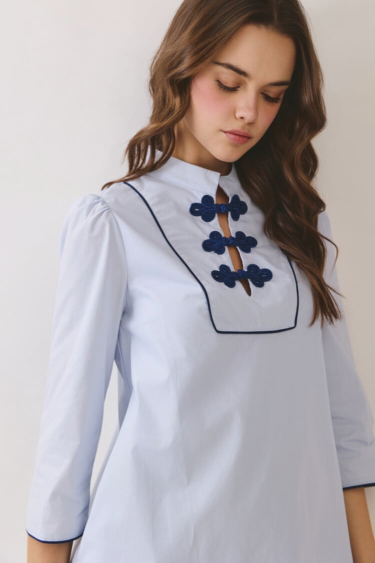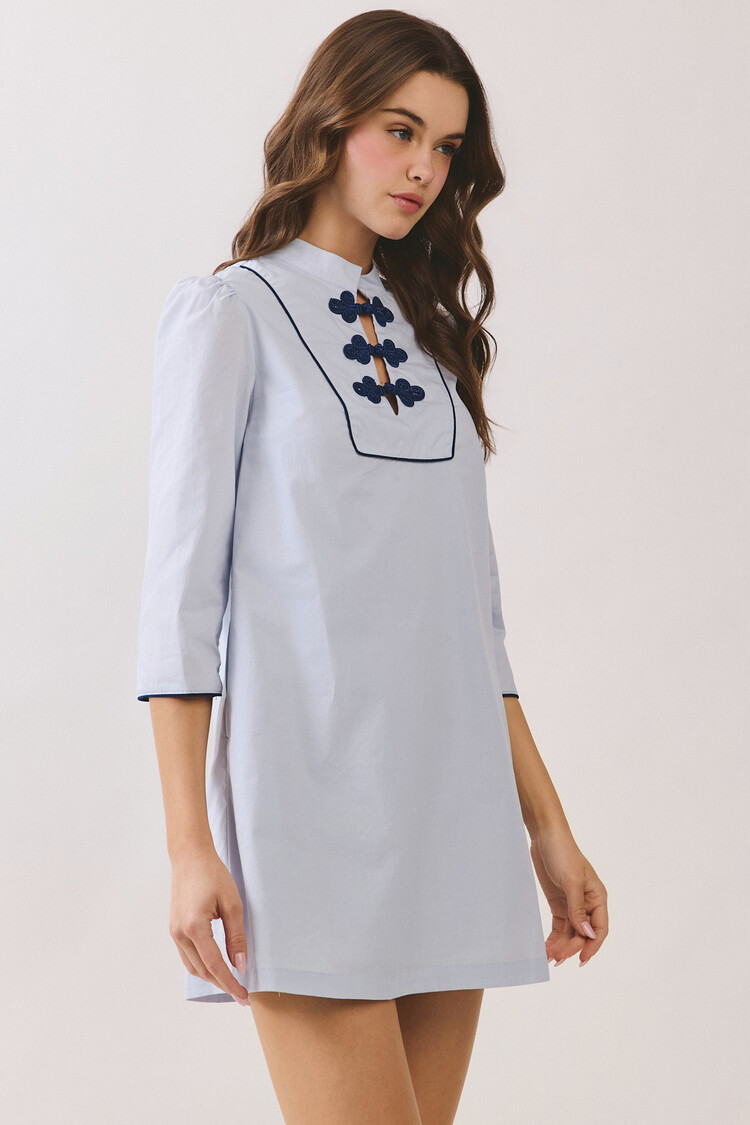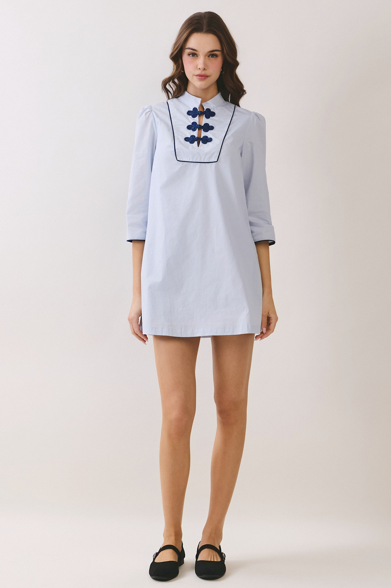 • A mini shift dress featuring a mandarin collar and contrast frog button details. Designed with three-quarter sleeves and a straight silhouette. Finished with subtle contrast piping. 100% cotton