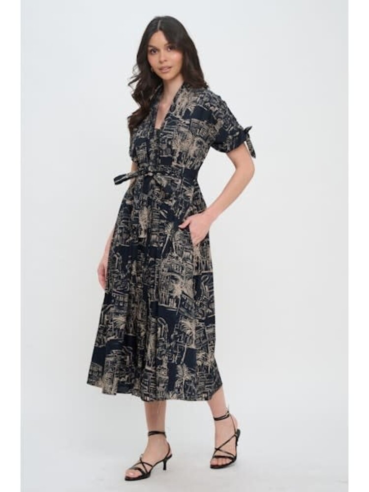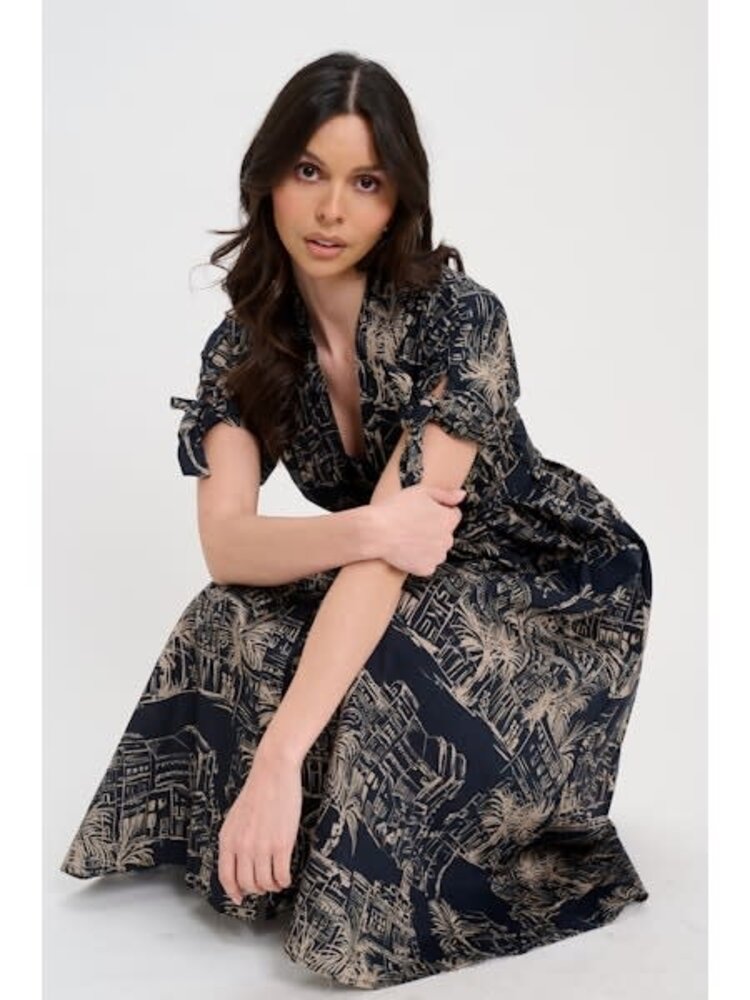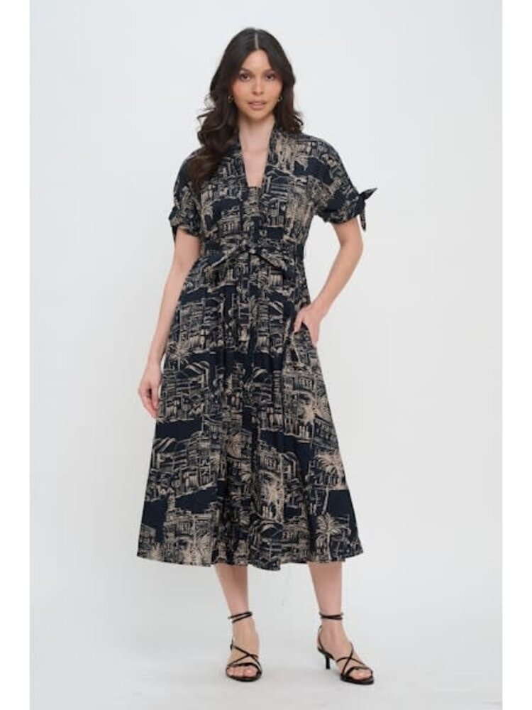 • Crafted with a feminine V-neckline, smocked waist, and short sleeves, this midi dress captures both drama and ease. The intricate sketch-style print evokes the charm of Grecian architecture, turning a simple silhouette into a wearable work of art.