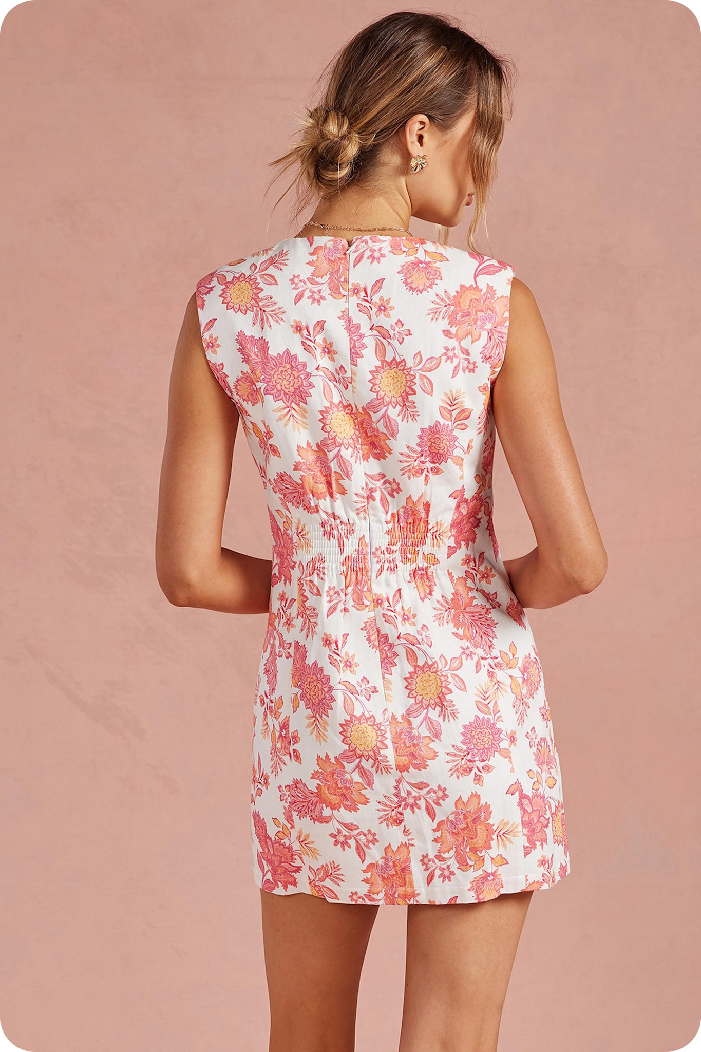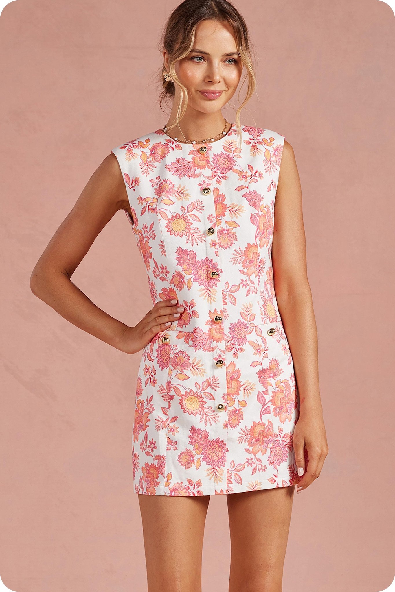 This classic versatile tailored mini dress features a sheath silhouette with elastic smocking at back waist, light shoulder pad, gold button front detail, front welt pockets, round neck, hidden zipper closure, and lining. 100% cotton