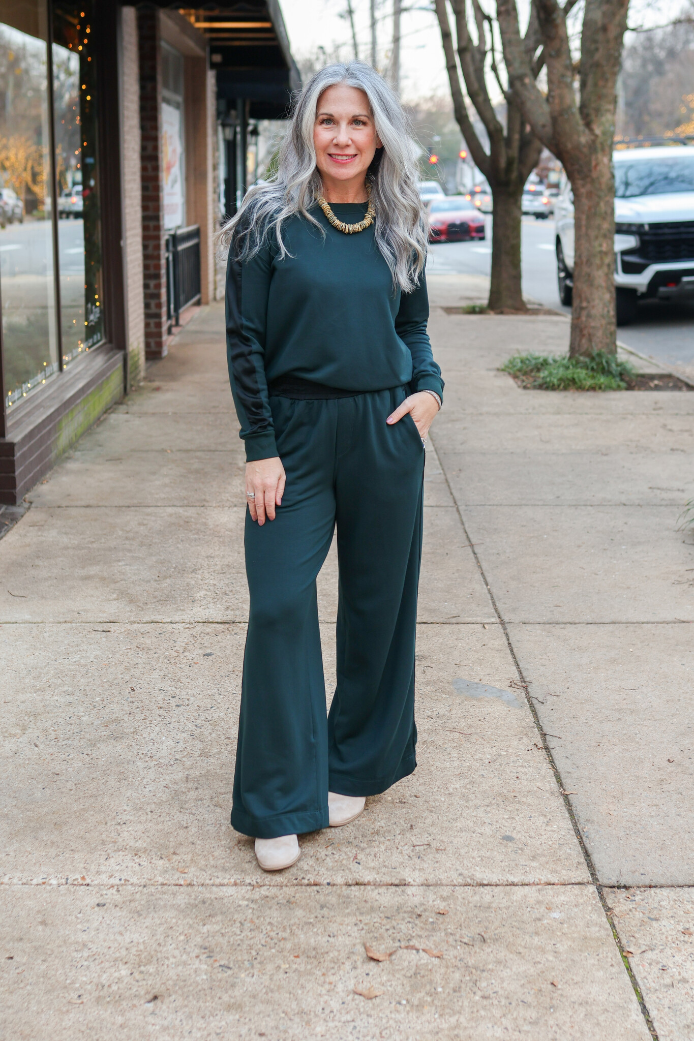 • Softest fleece wide leg trousers in everfall green with satin trimming on the sides. Cinched at the waist and with pockets. Pair with our Softest Fleece Satin Trimmed Pullover.