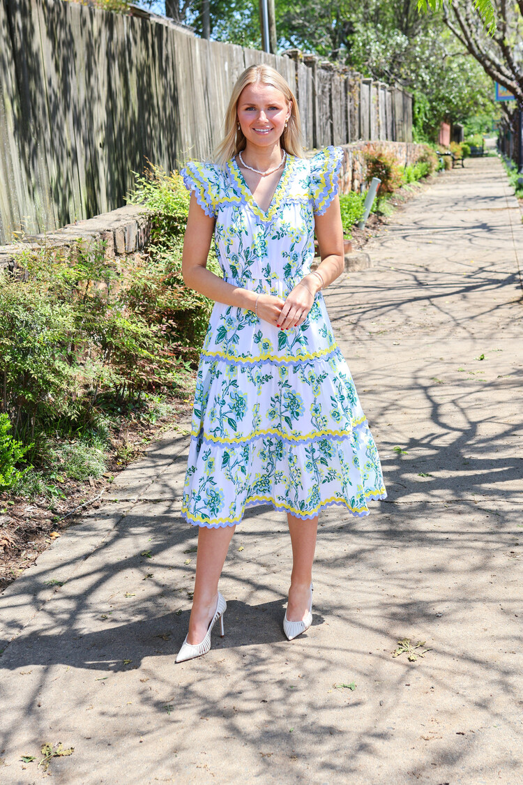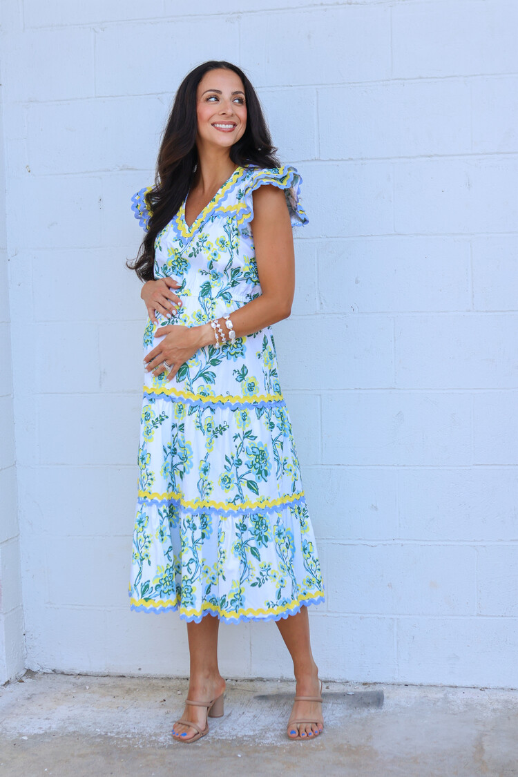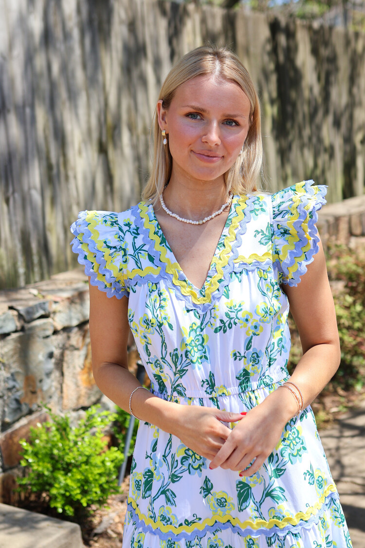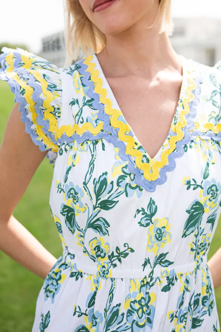 Crafted in stretch cotton poplin in a floral vine print, this piece features contrasting ric-rac trim, a tiered skirt, pockets, and a stretchy waistline. This fully lined dress is perfect for backyard parties, date nights and dinner al fresco with friends