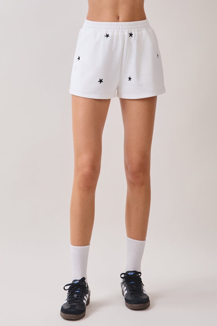 Cozy knit sweatshirt featuring an allover star embroidery detail, relaxed drop-shoulder sleeves, and a loose, comfortable fit. Finished with ribbed cuffs and hem. Pair with Matching shorts! 50% Cotton, 50% Polyester