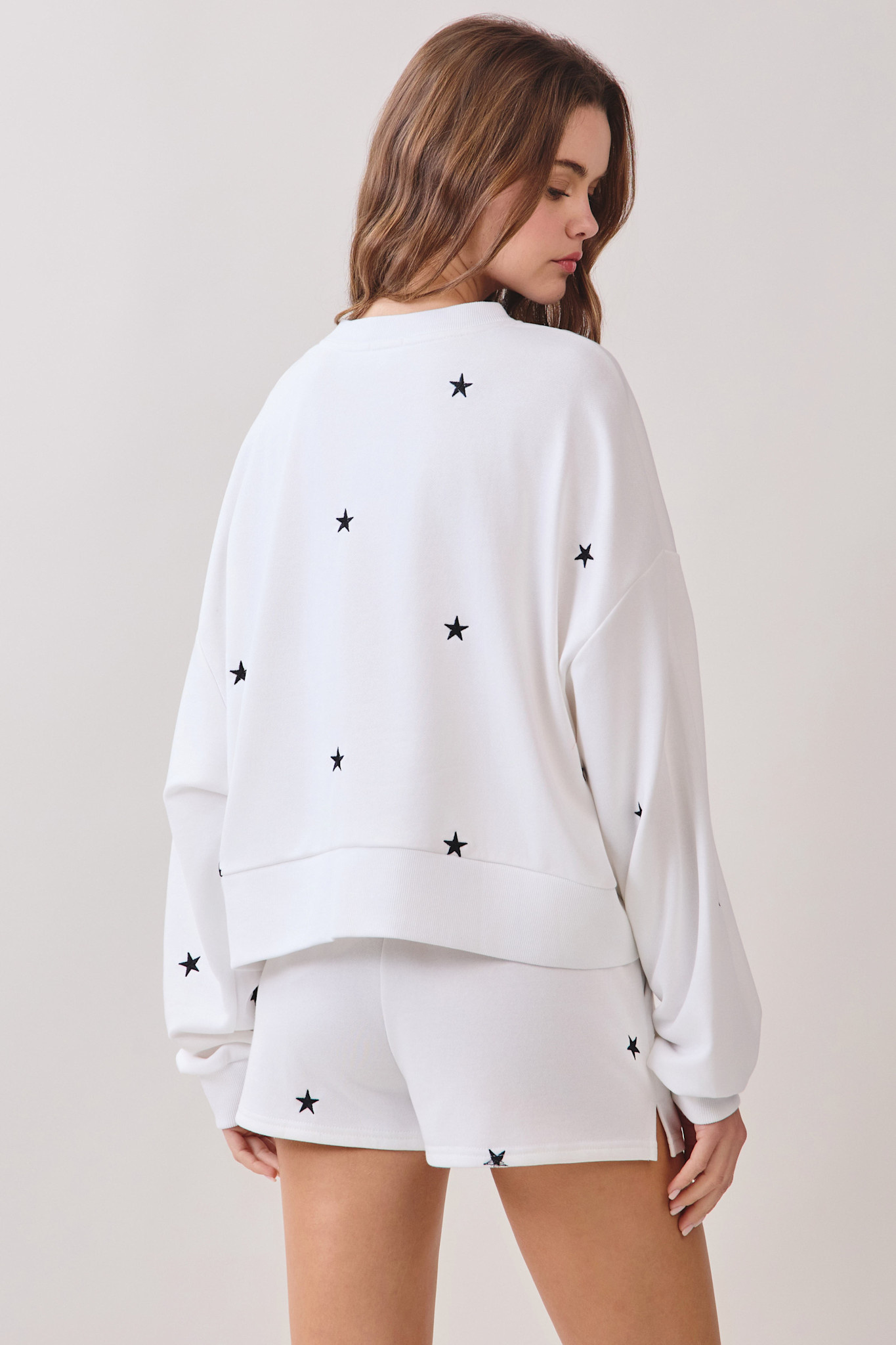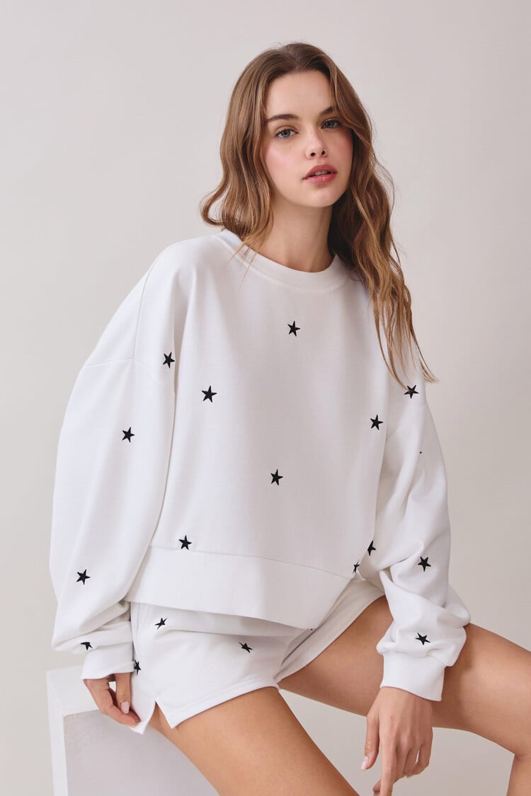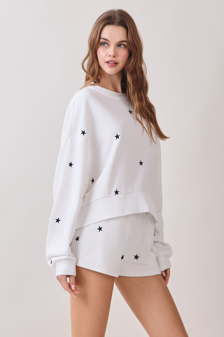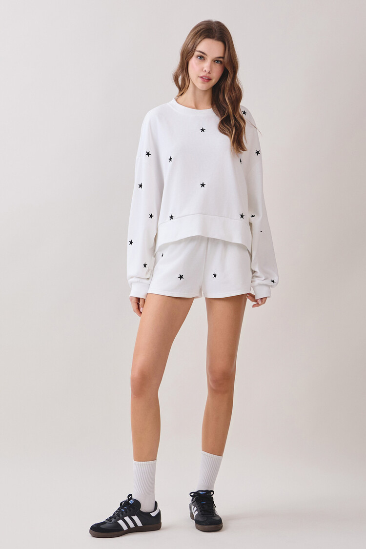 Soft knit mini shorts featuring an elastic waistband for a comfortable fit. Designed with scattered embroidered star motifs throughout. Pair with Matching sweatshirt! 50% Cotton, 50% Polyester