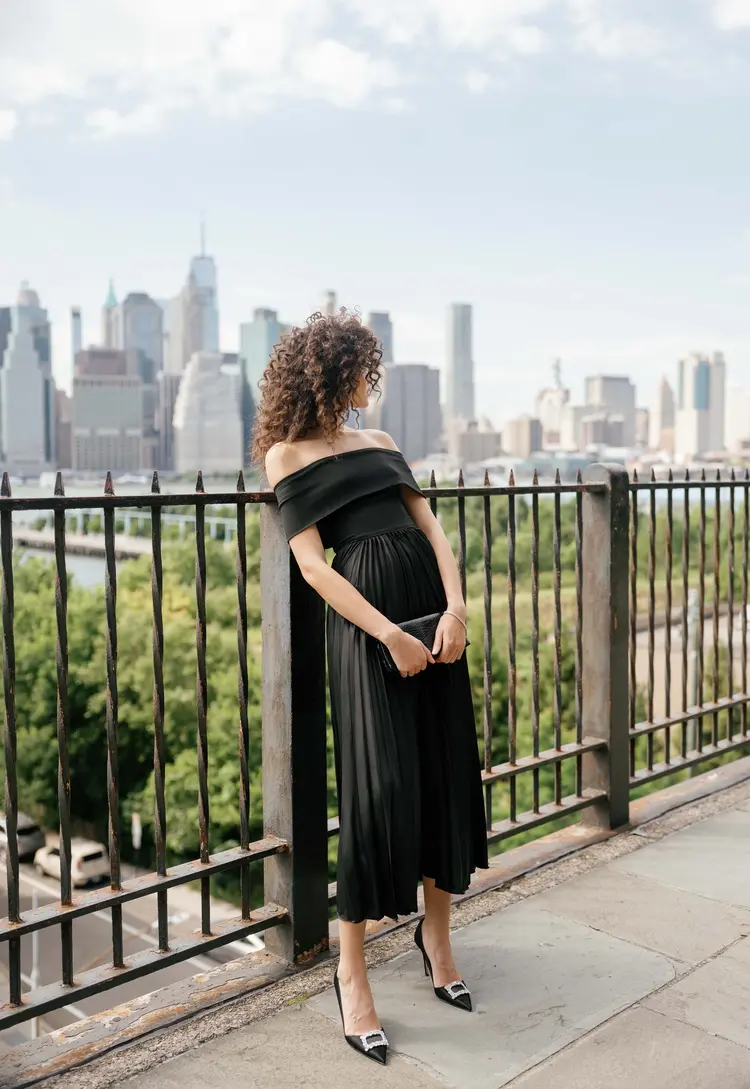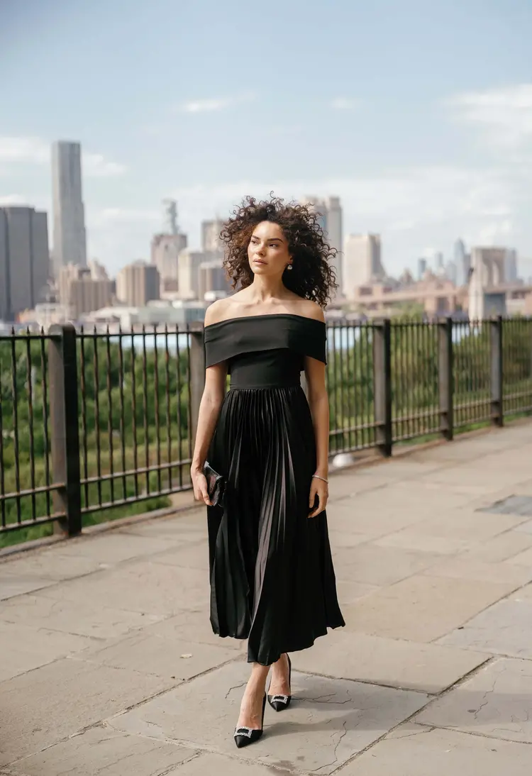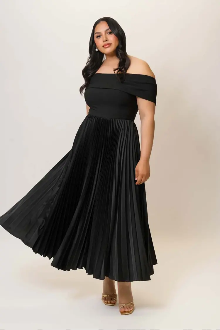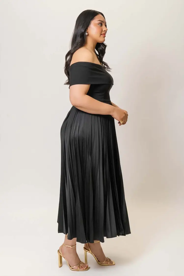 • off the shoulder pleated midi dress