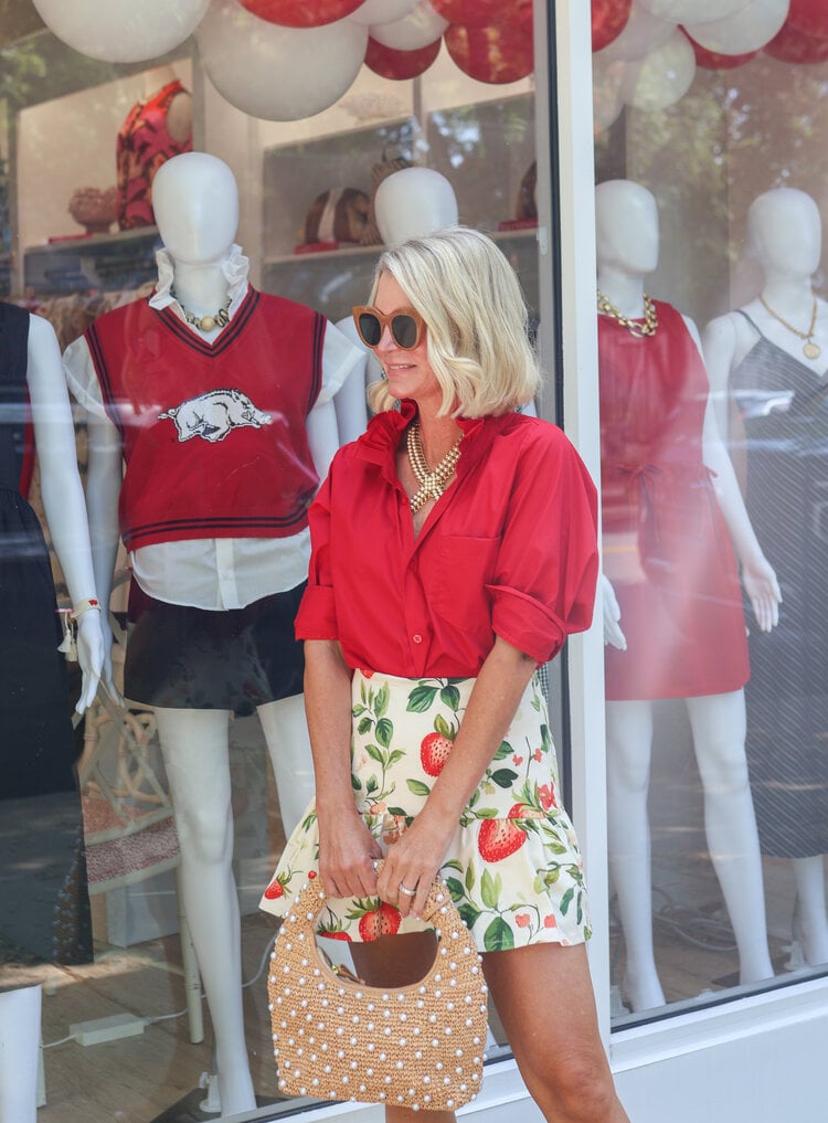 • A tiered mini skirt featuring a vibrant strawberry floral print. Designed with a flattering high waist and side zipper closure for a clean fit. Pair with The matching top