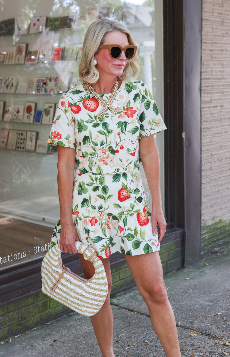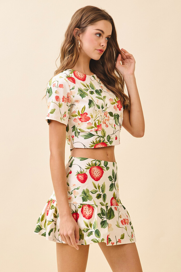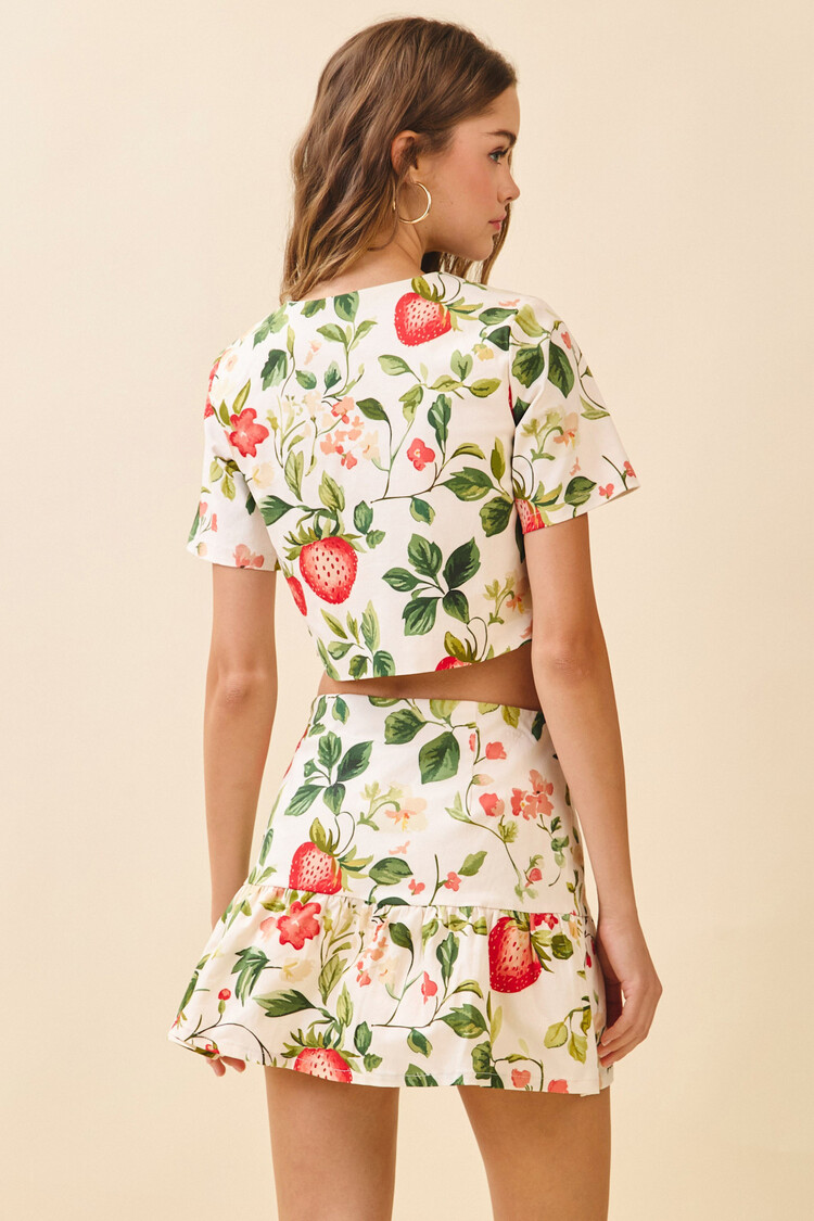A cropped short-sleeve top featuring a vibrant strawberry and floral print. Designed with a rounded neckline, button placket at front. Pair with The matching skirt