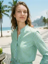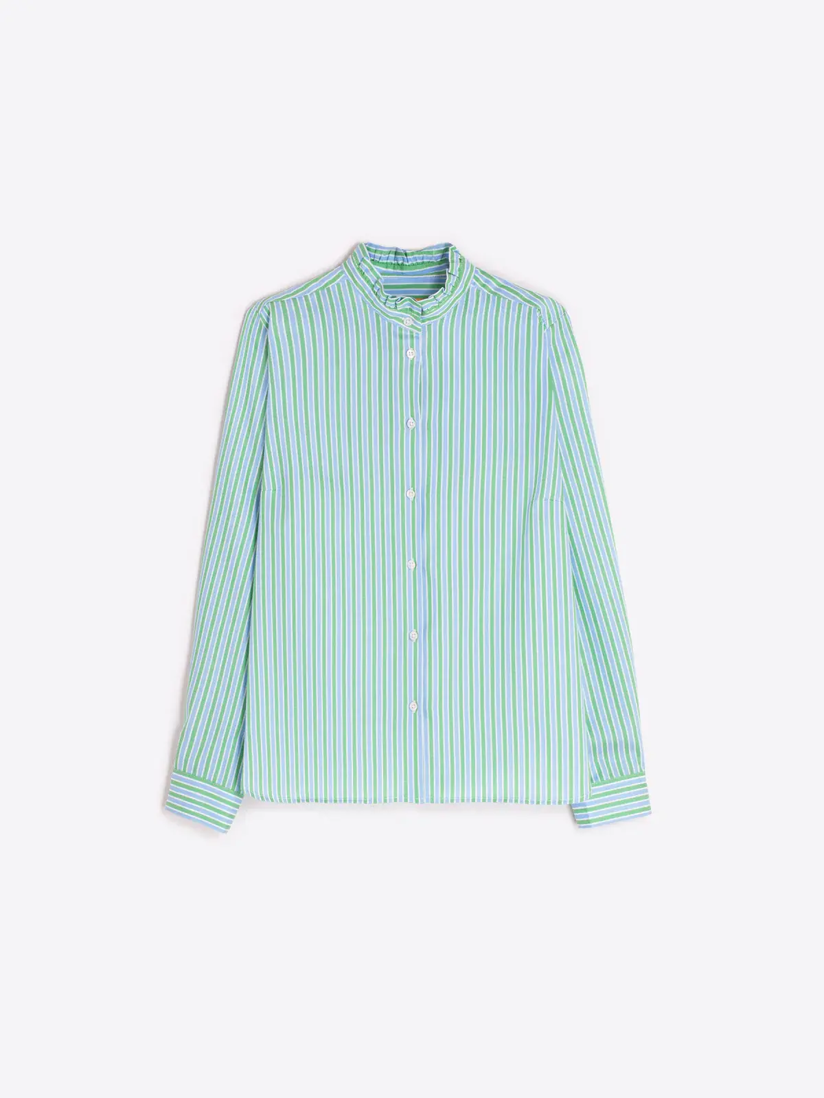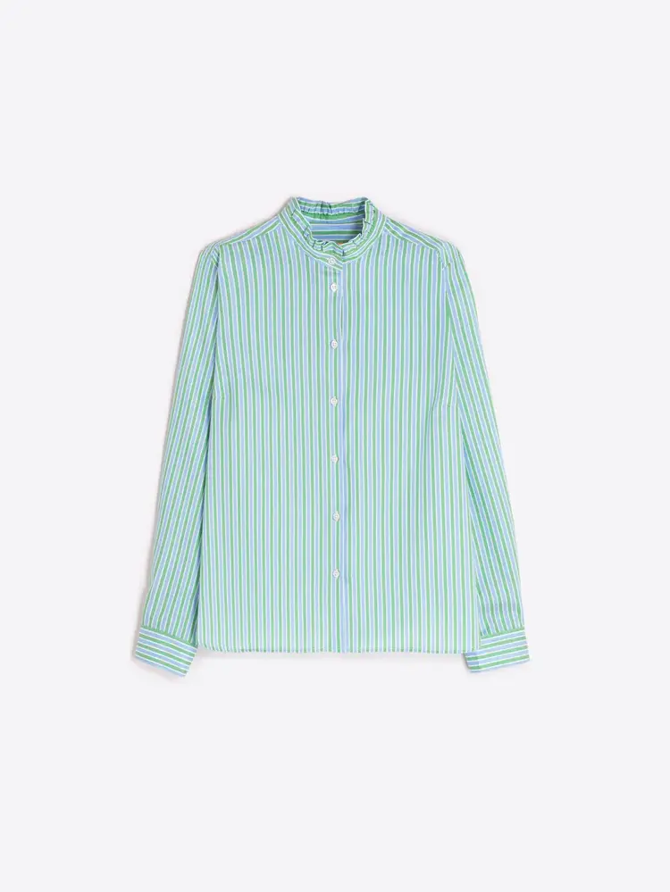 • Shirt with vertical stripes in green, blue, and white. Round neck with ruffle, long sleeves, and buttoned cuffs. Straight cut. 100% COTTON