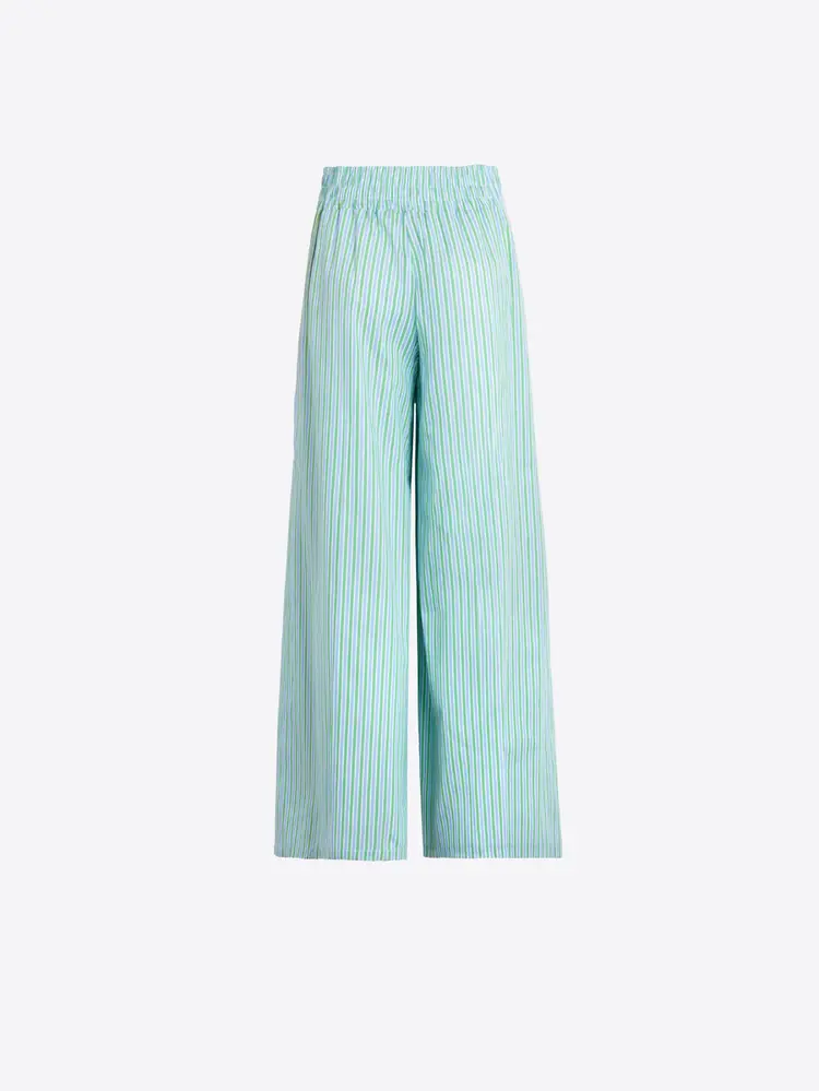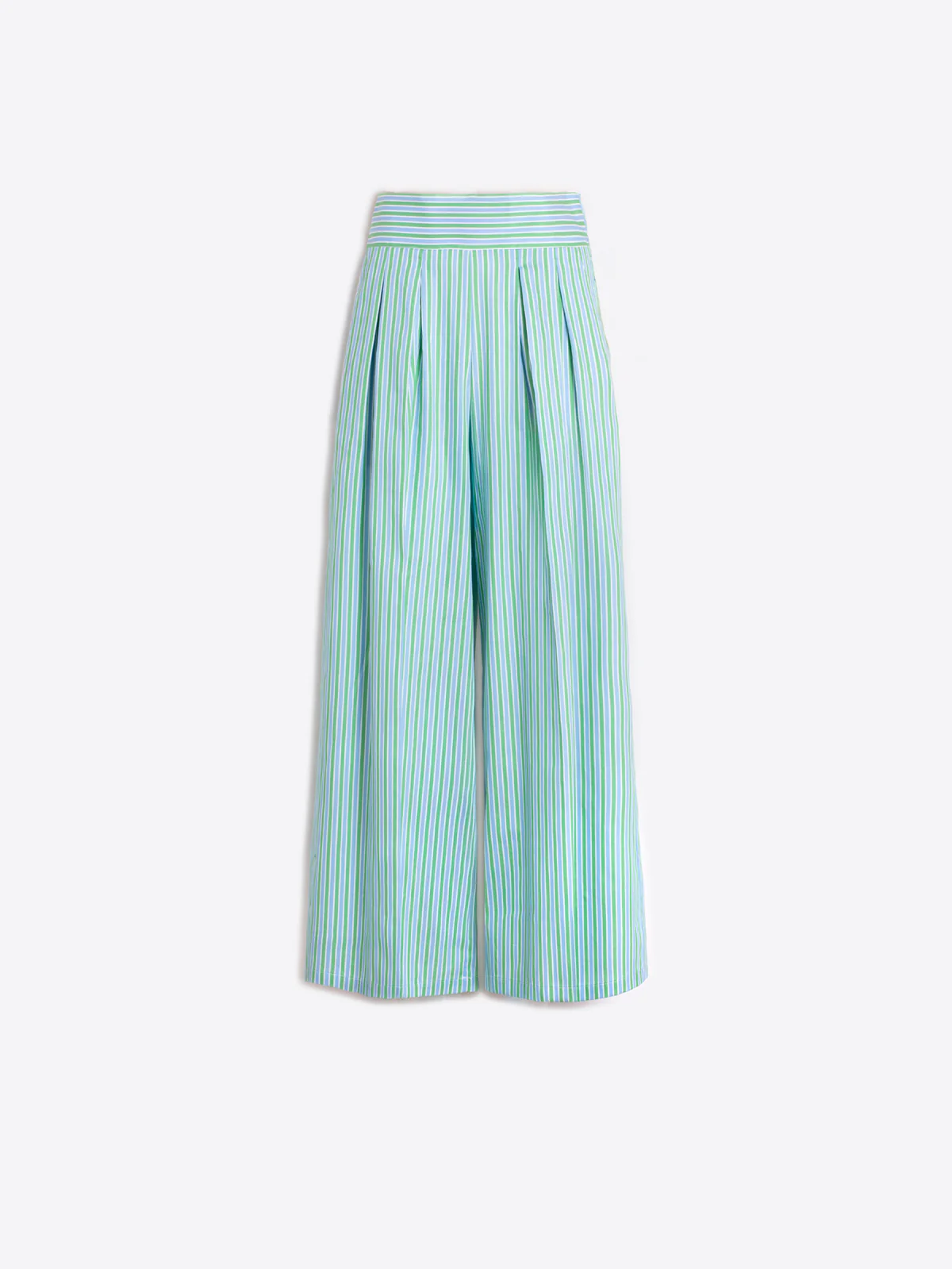 • Wide-leg trousers with vertical stripes in green and blue tones. Wide waistband with front pleats. Cut with very wide legs and a straight hem. Side pockets. 100% COTTON