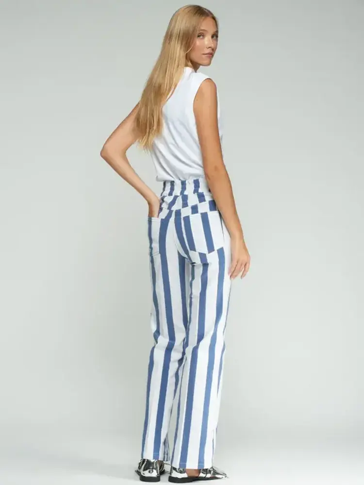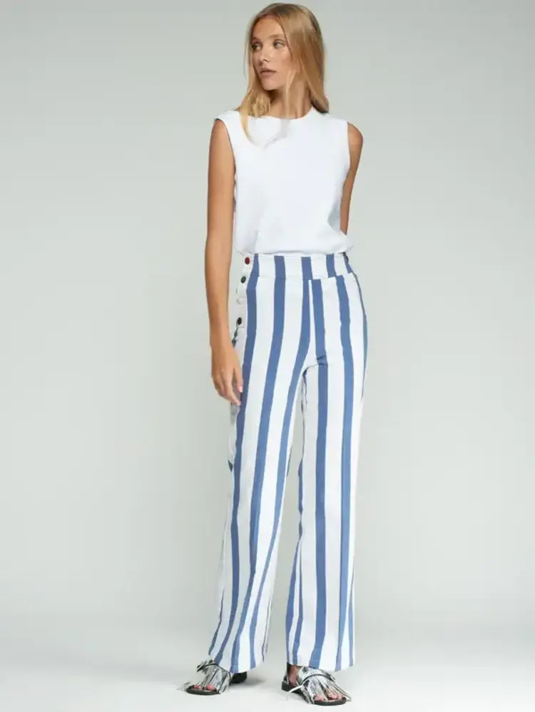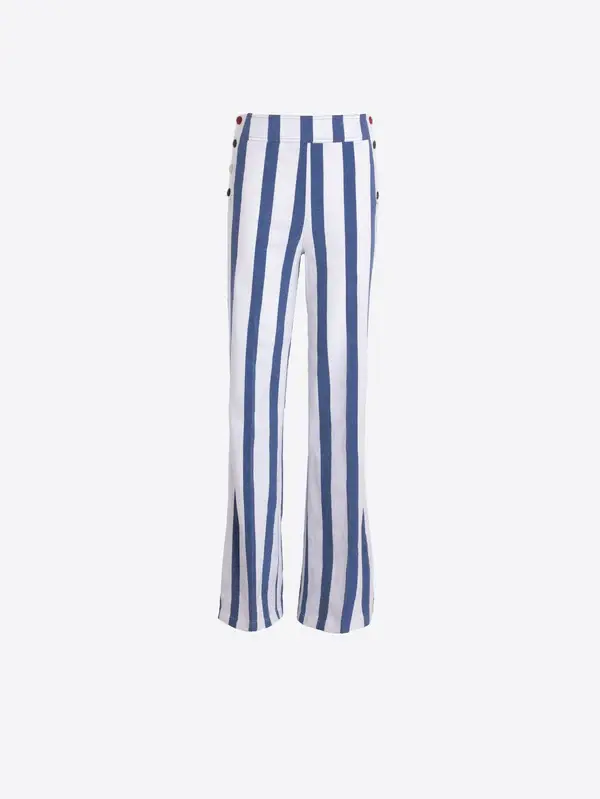 • Straight-cut trousers with a vertical striped print in blue and white. Decorative buttons on both sides of the waistband.