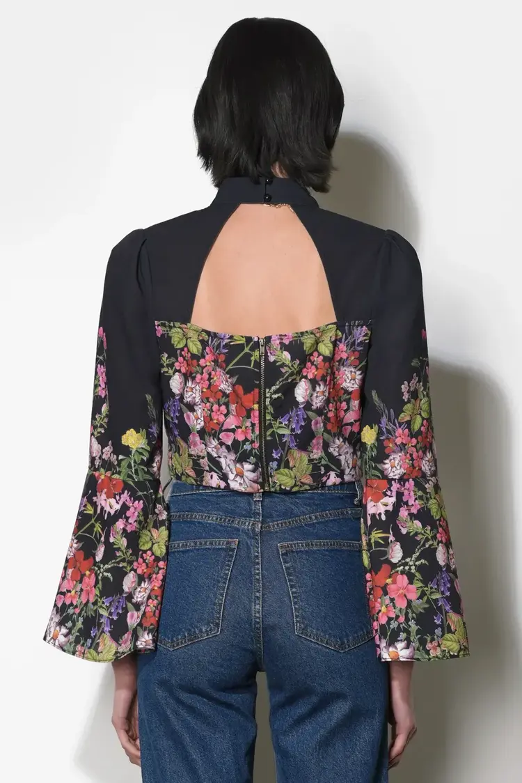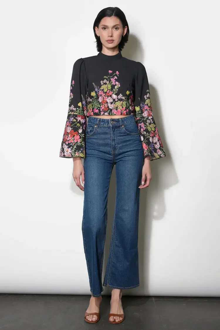 • The design is defined by its dramatic bell sleeves, which add volume and movement to the arms, and its flattering crop length, which hits at or above the natural waist. The print keeps the top feeling light and feminine, ideal for social occasions.
