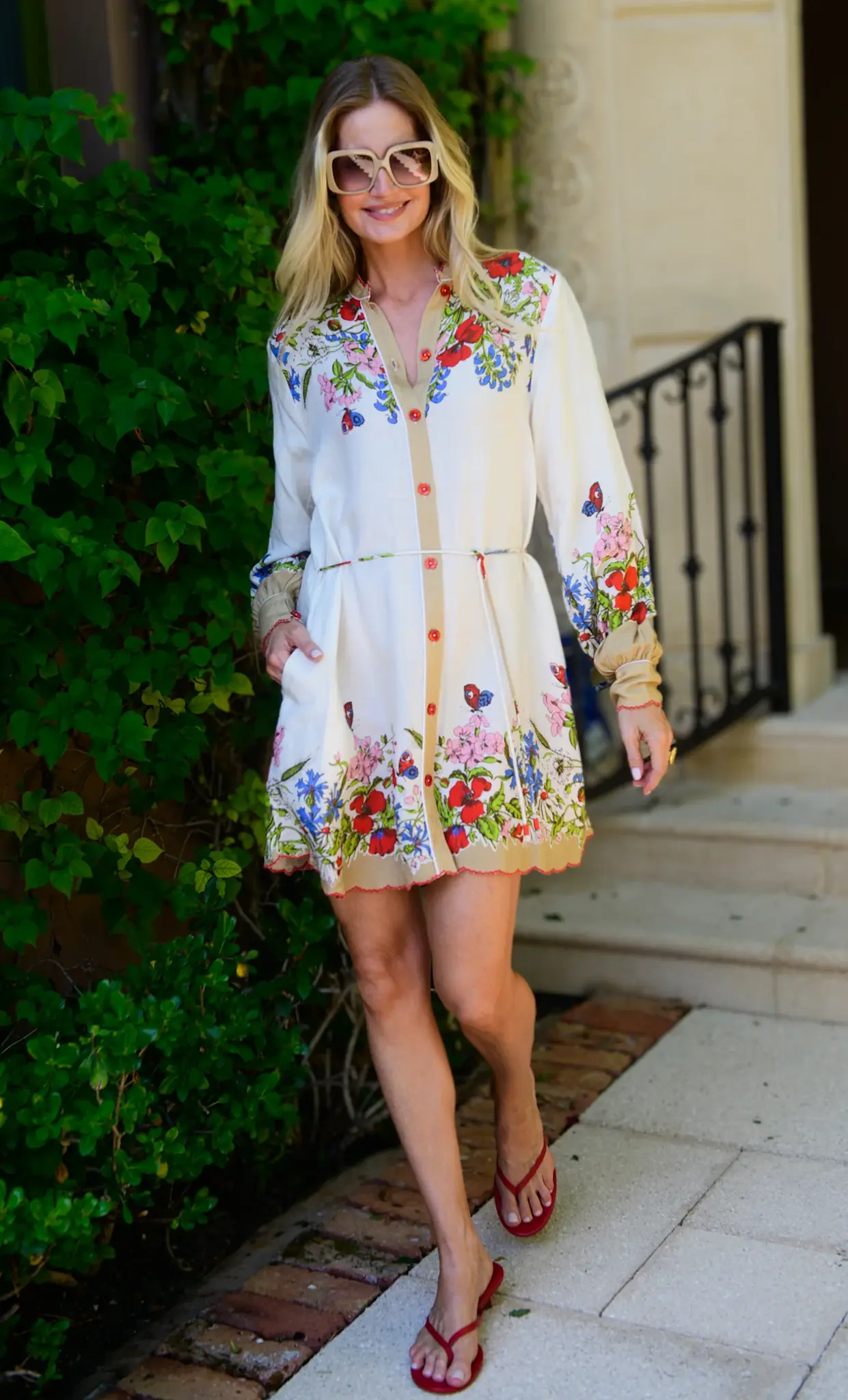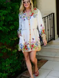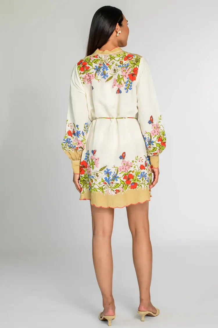 Tara is the style of the season! Her easy wear silhouette features a front placket, balloon sleeves, and a cord belt, with flower shaped buttons and picot trim accents to complement this beautiful floral motif.