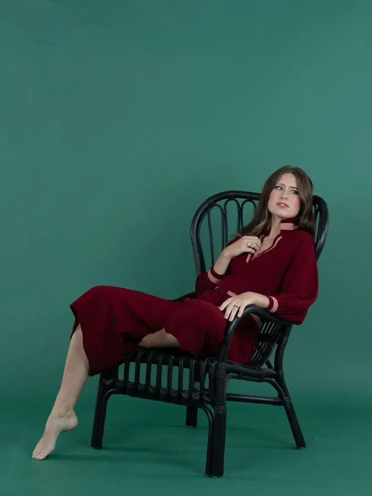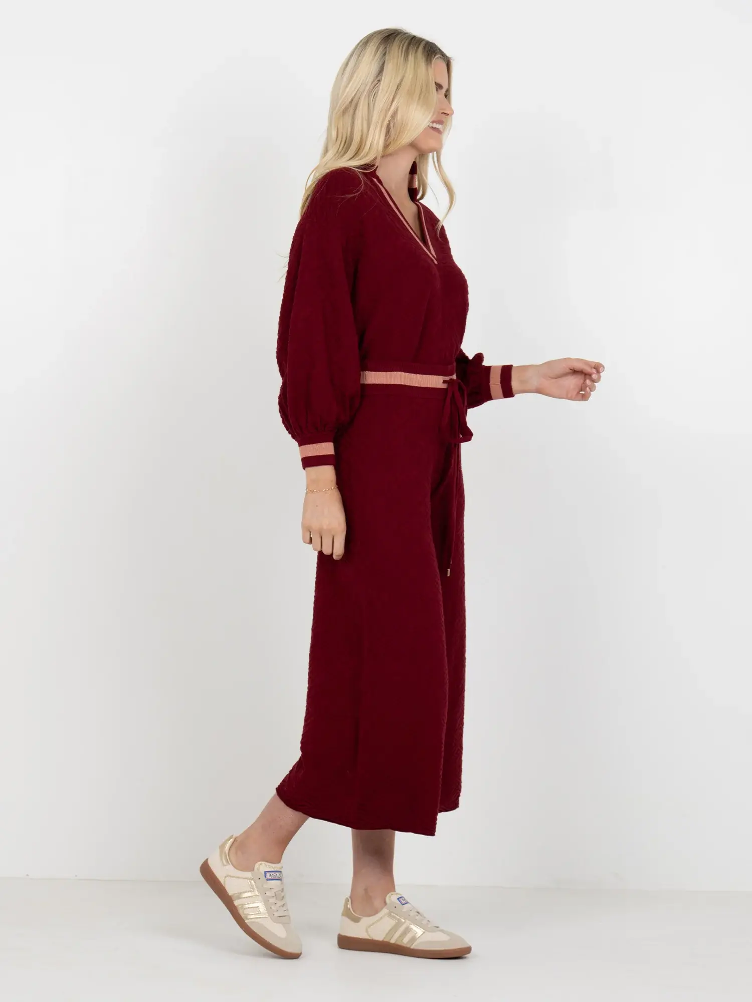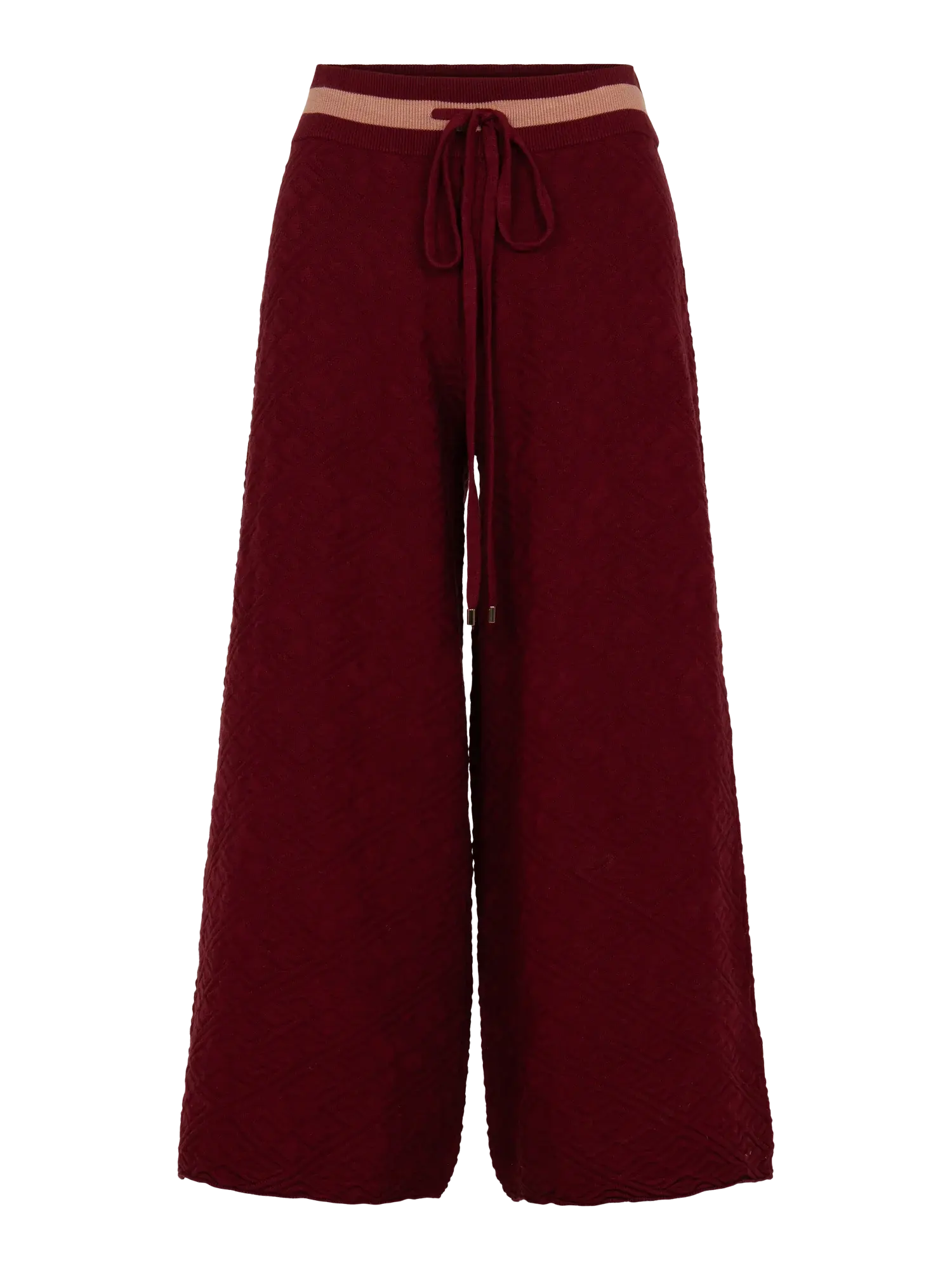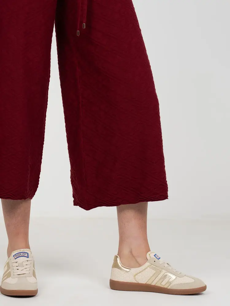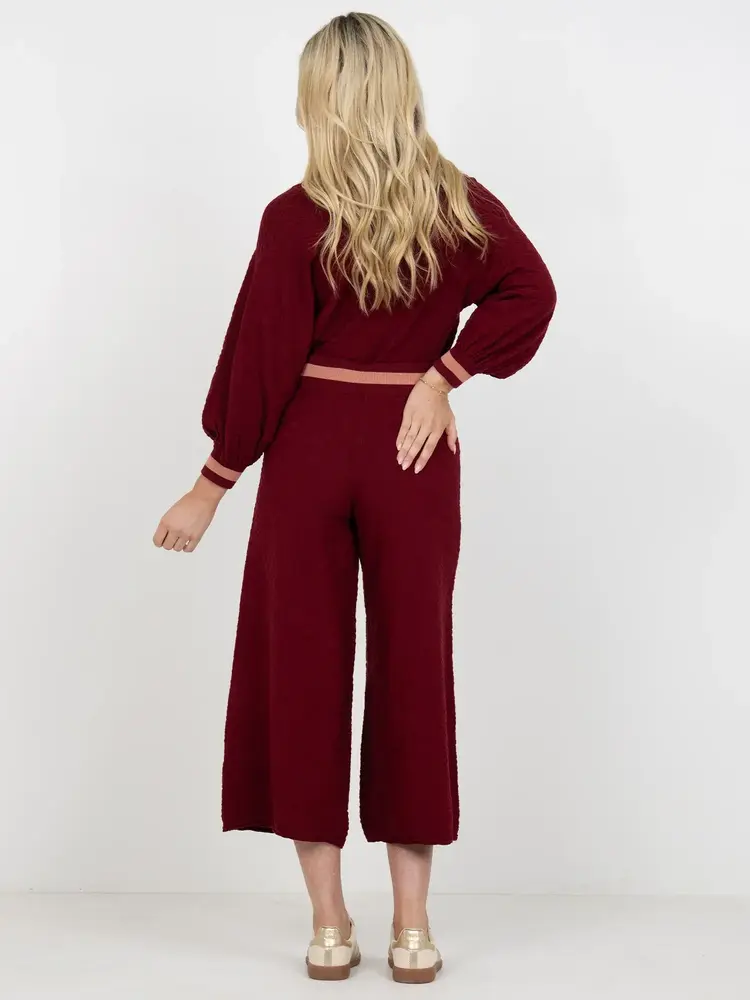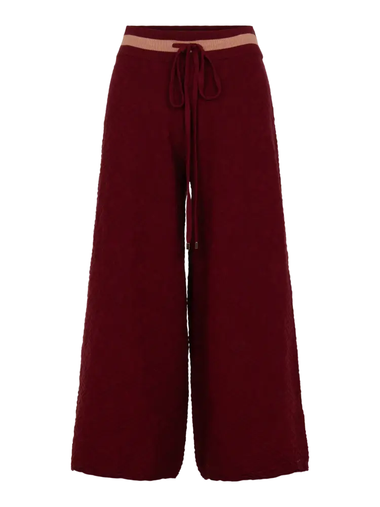 • The Teddy Crop Trouser in Merlot Monogram redefines cozy refinement with a branded twist. Designed with a high-rise drawstring waistband and cropped wide-leg silhouette, this style flatters while offering ease of movement.