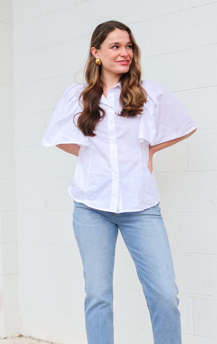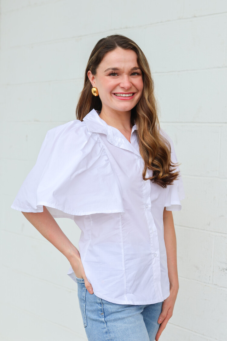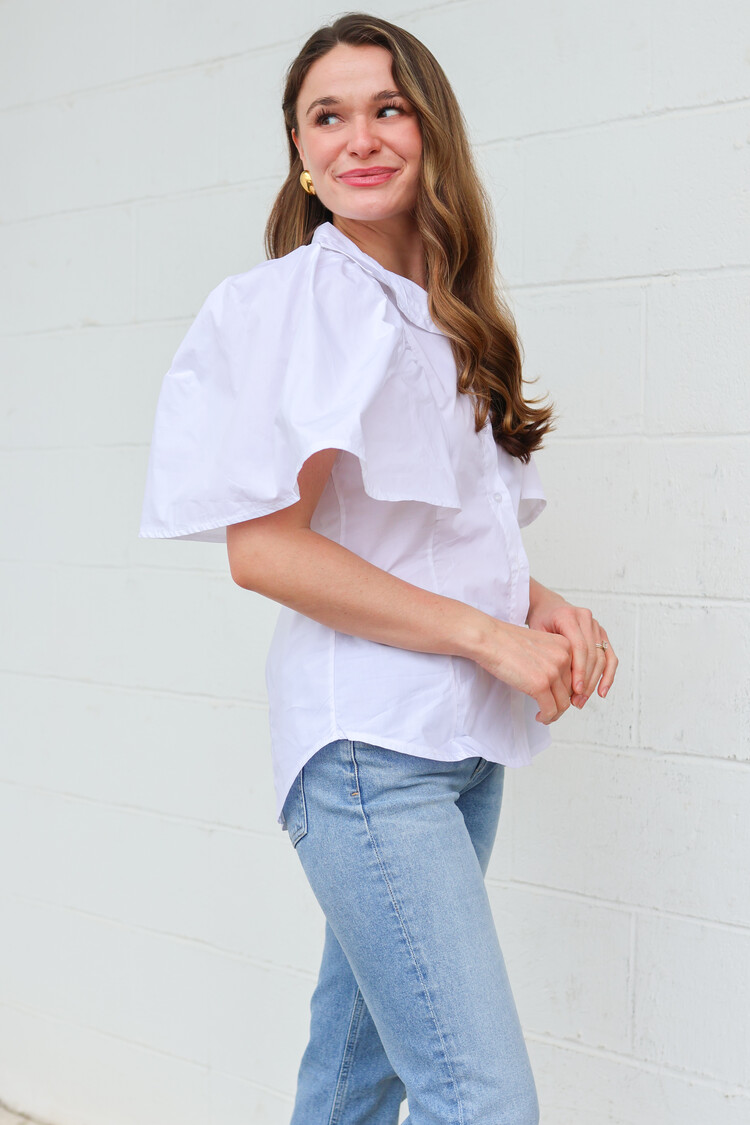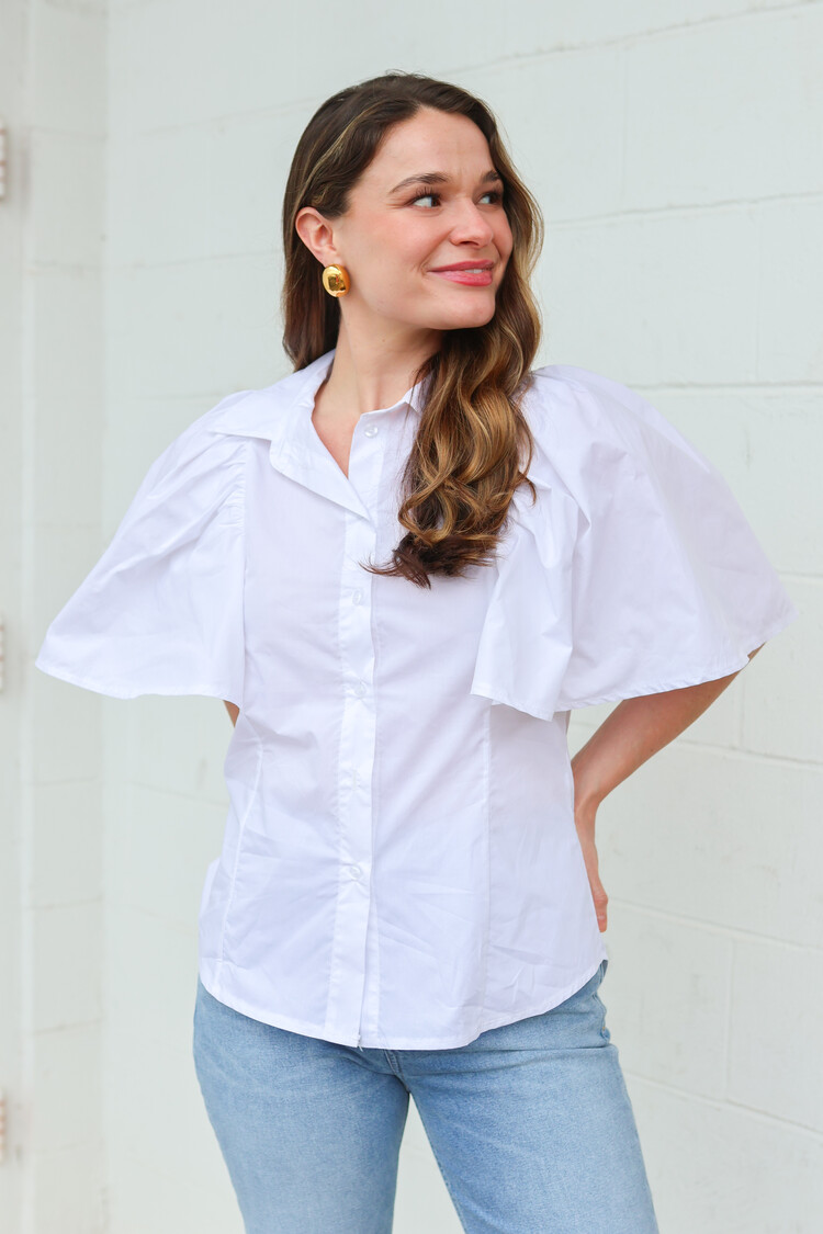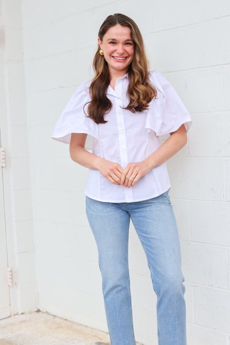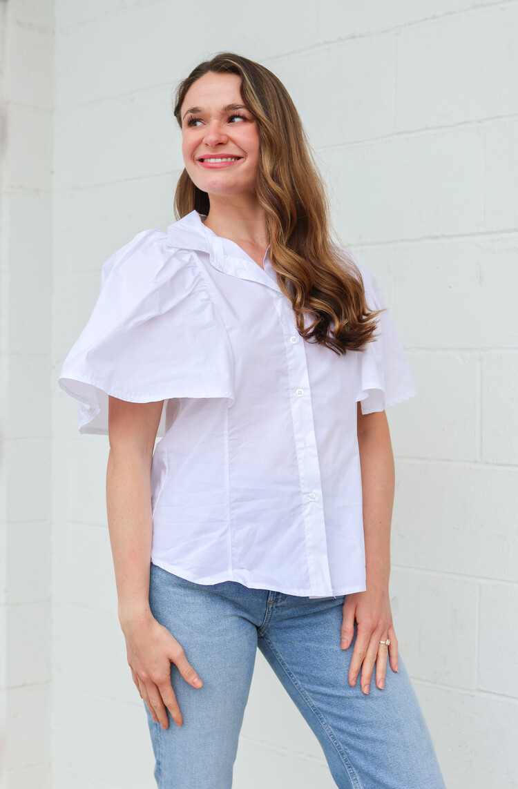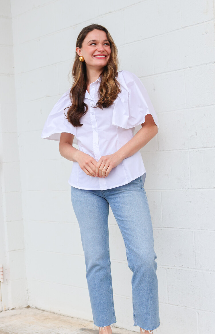 • A fun twist on a classic whit poplin top! We love the beautiful flutter sleeves.