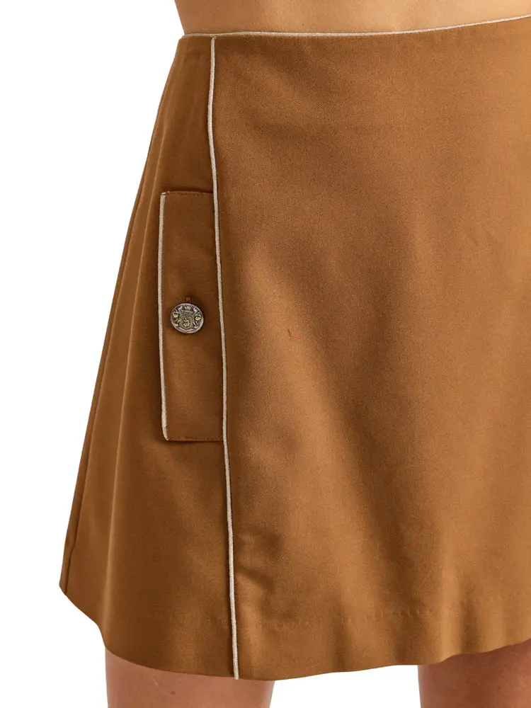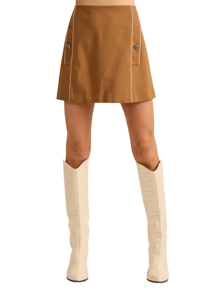 • This cute skirt features convenient pockets and button closure for easy wear. The cream piping adds a subtle contrast that enhances its polished look. Perfect for pairing with cozy sweaters or elegant blouses, it offers versatile style for any occasion.