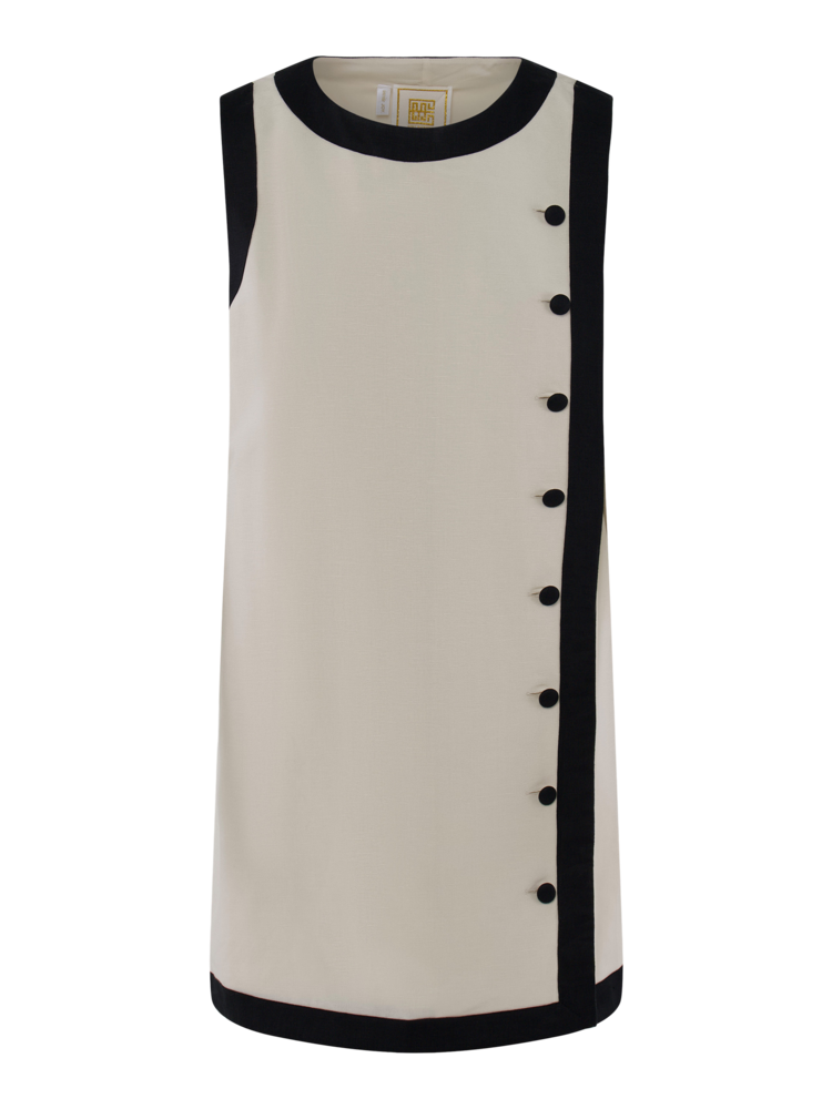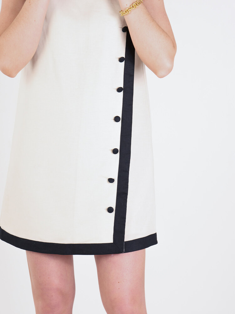 Crafted from luxurious linen, this dress showcases a sleek straight silhouette, refined round neckline, and a row of covered buttons that trail down the front side for a touch of polished charm. Framed with contrast trim in classic black and ivory!