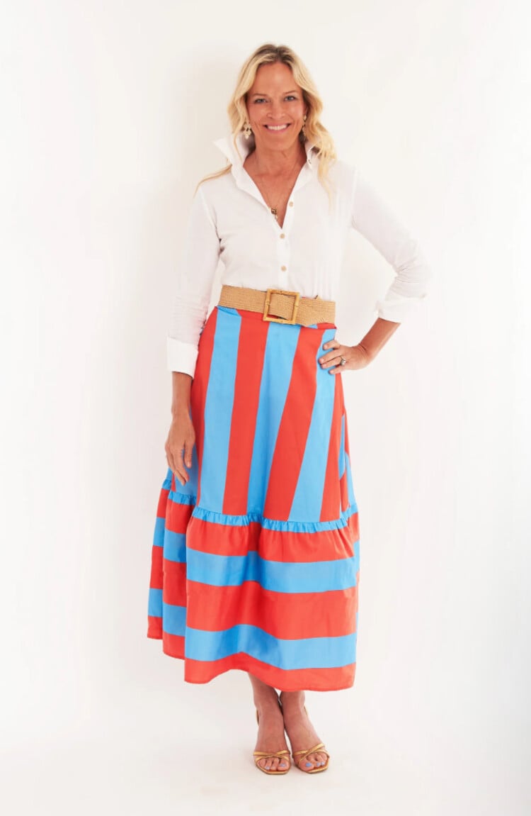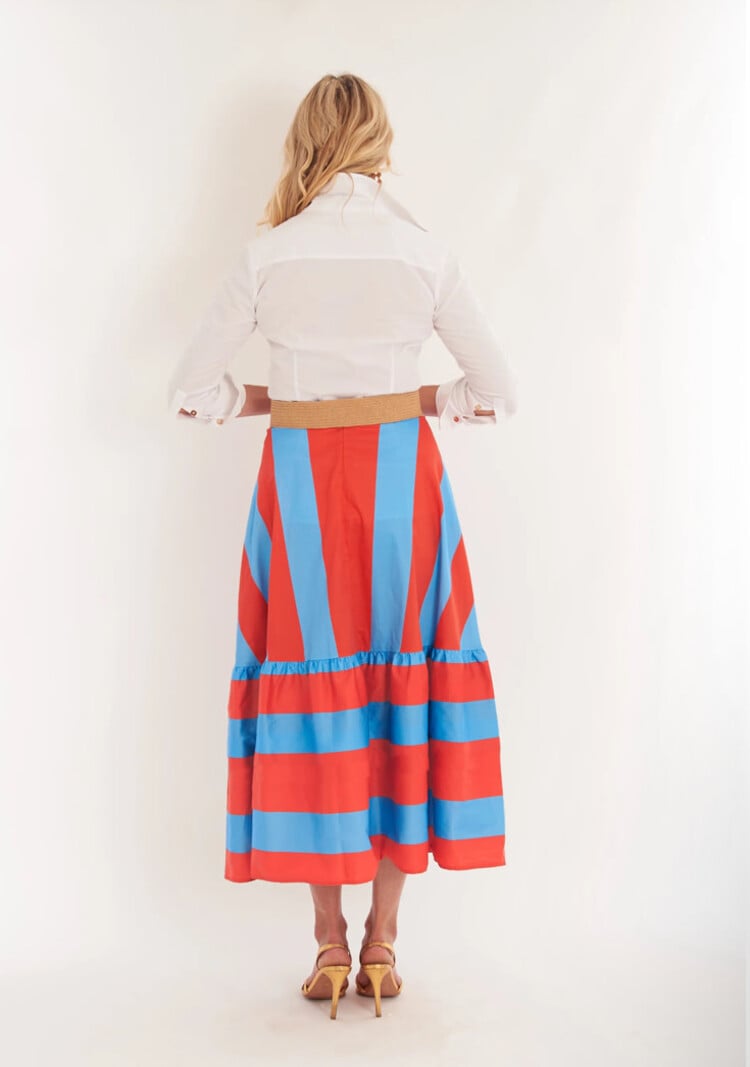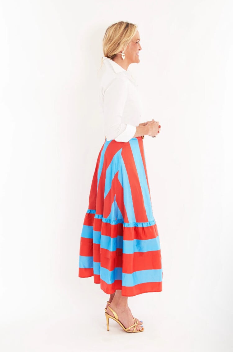 • Meet your new wardrobe essential—the Trask Skirt in Americana Stripe. Flattering and versatile, it's the kind of skirt that transitions seamlessly from day to evening, ready for whatever adventure comes next.