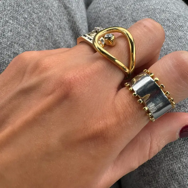 The Tribeca Ring is a cigar band ring that exudes edginess and boldness. Its unique design features striking gold accents, and is crafted with mixed metals for a truly unique and eye-catching look. Plus, it's water-resistant for added convenience.