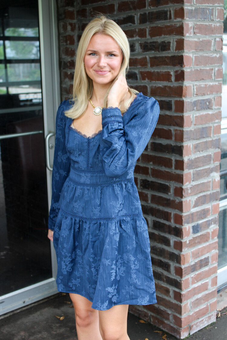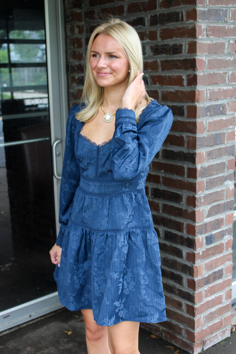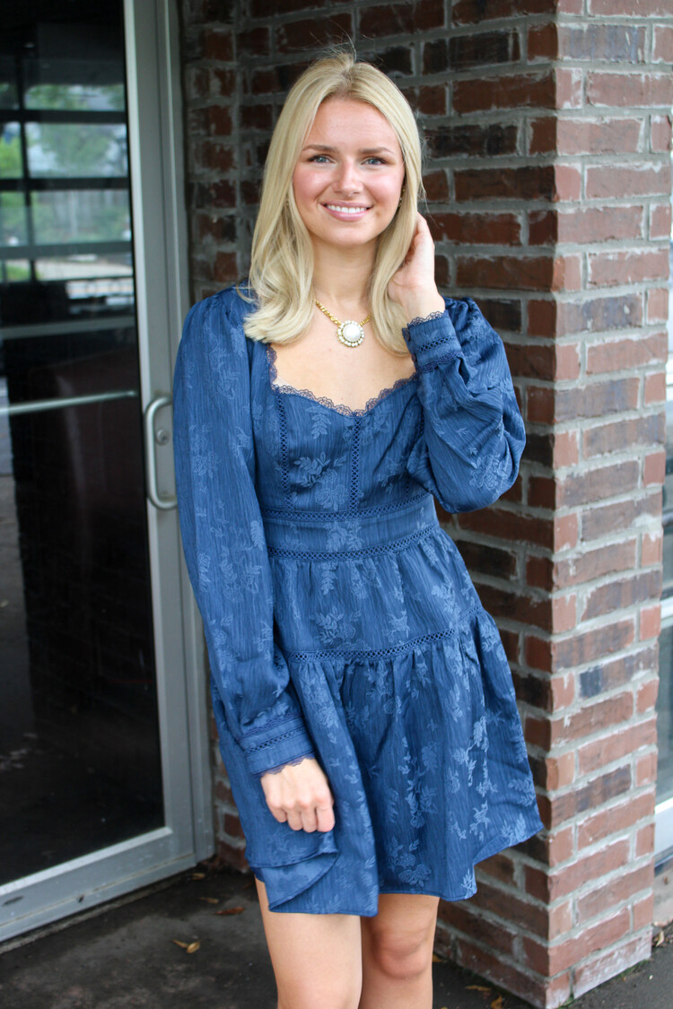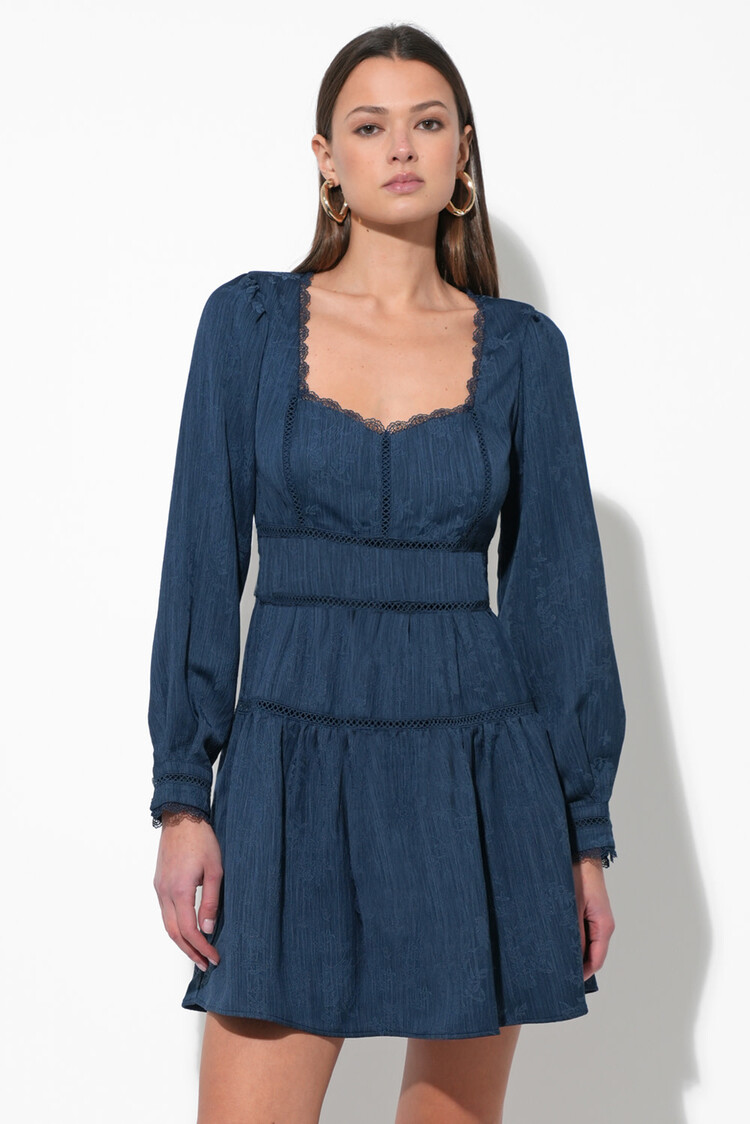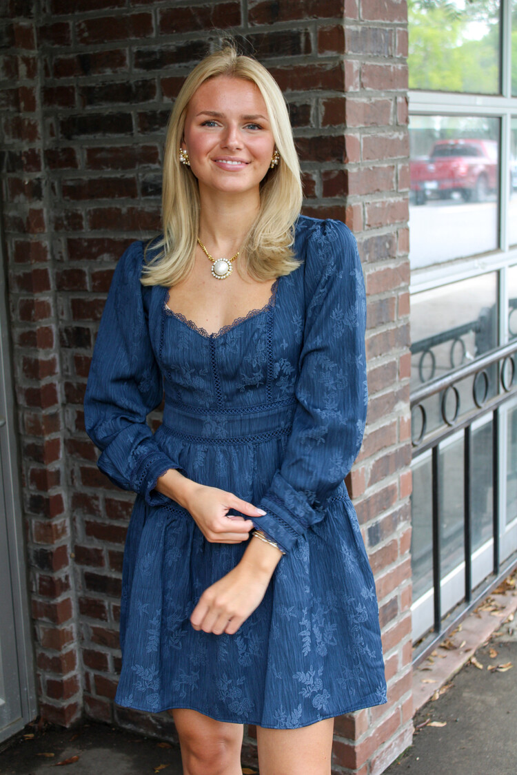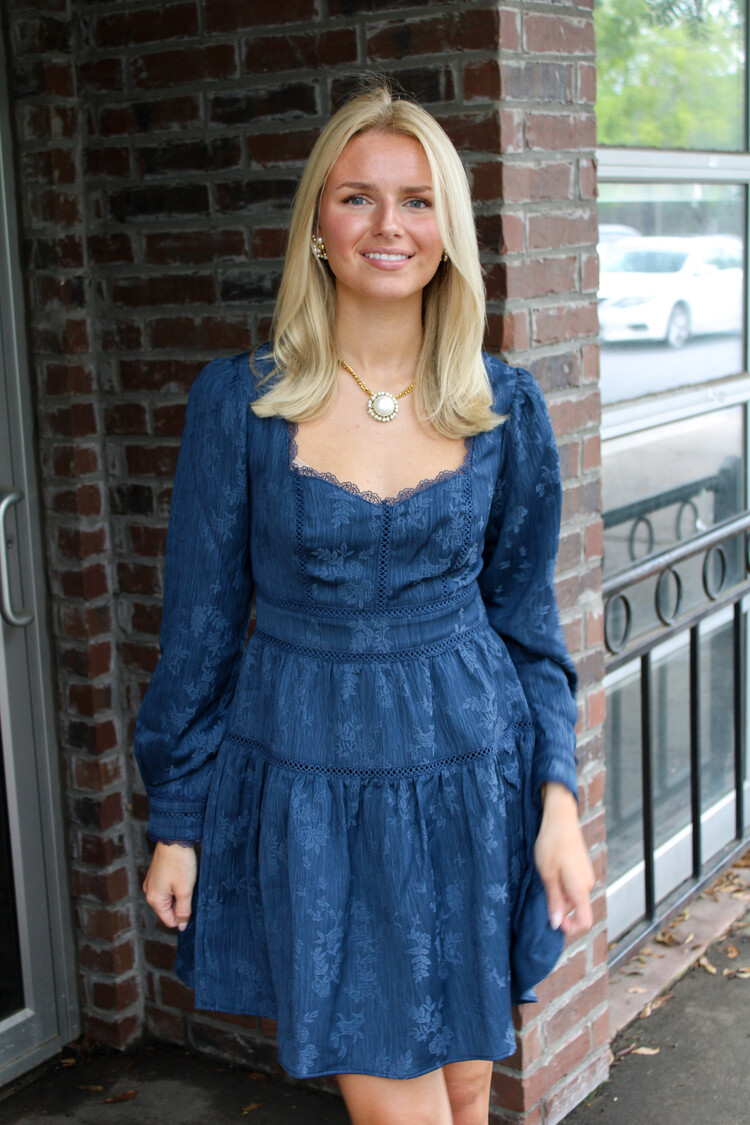 • It is crafted from a navy blue fabric with a subtle, textured stripe and floral pattern woven throughout. The dress features a flattering sweetheart neckline with delicate lace trim along the edges.