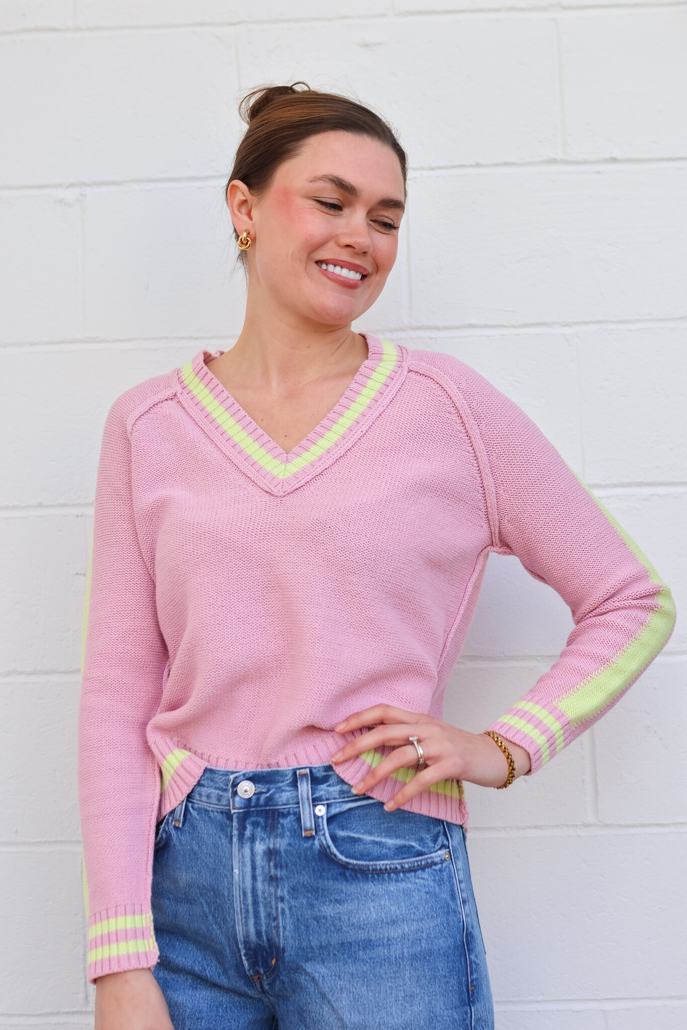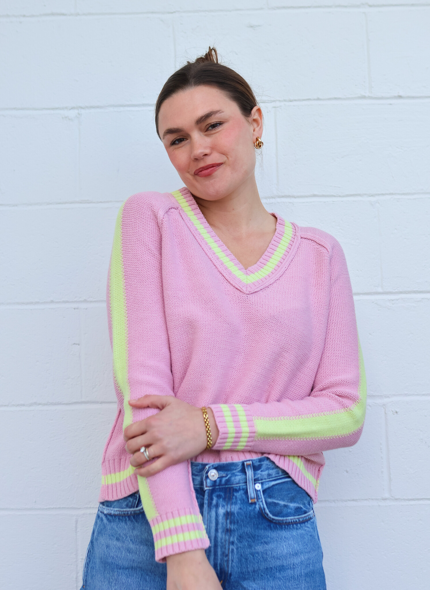 The Two Timer Sweater is a versatile sweater designed with contrast stripes and exposed seaming for an effortlessly chic aesthetic. Hand-embroidered accents add artisanal character, creating a relaxed, refined piece that works seamlessly into any wardrobe