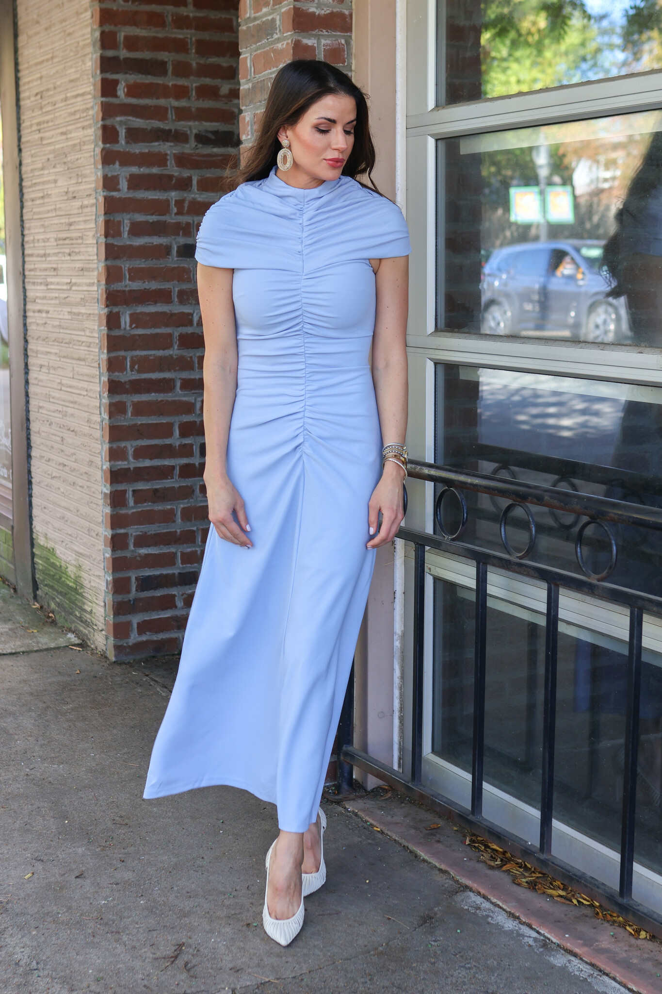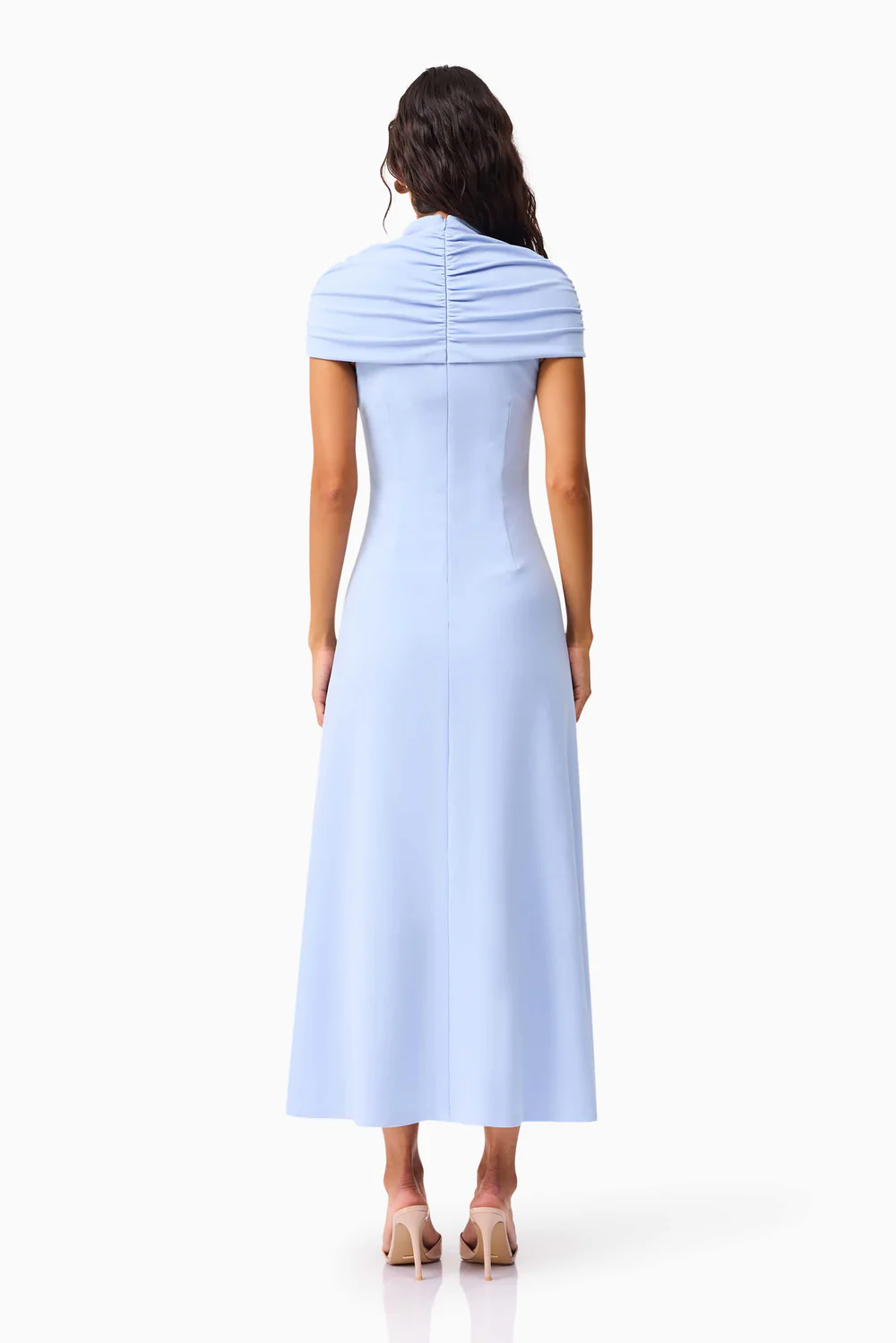 The Valencia High Neck Maxi Dress in Blue is a modern silhouette with refined elegance. Designed in Bella stretch crepe, the fabric has a subtle drape with gentle give, allowing the fitted cut to sculpt the body with comfort and ease.
