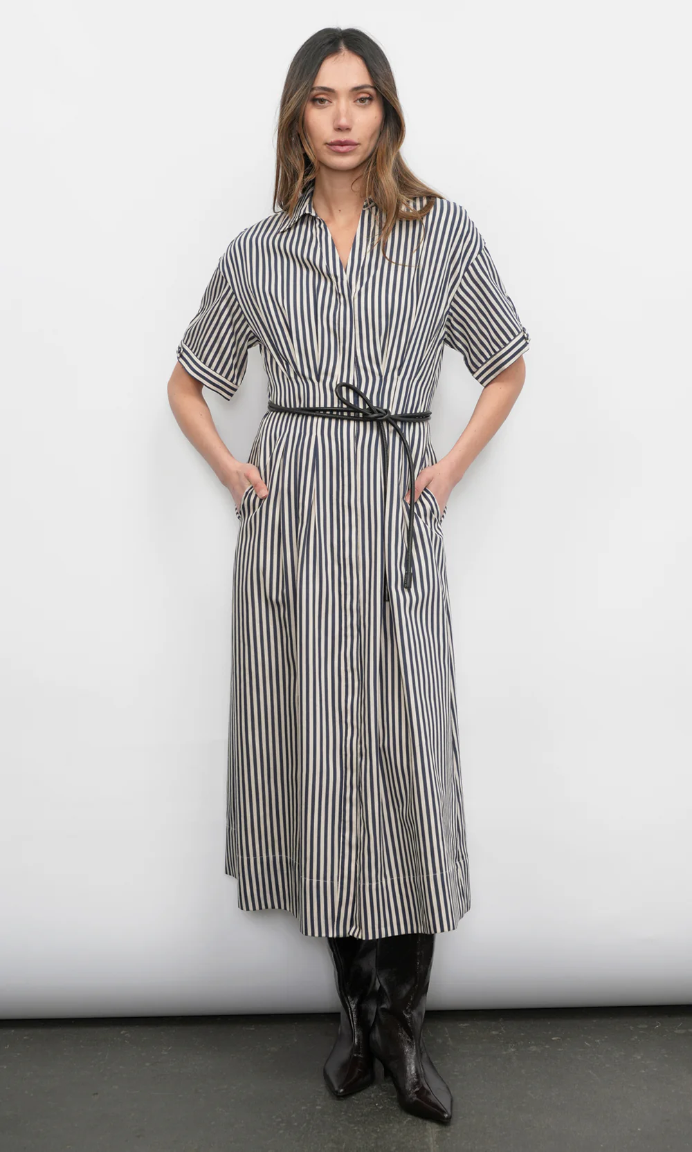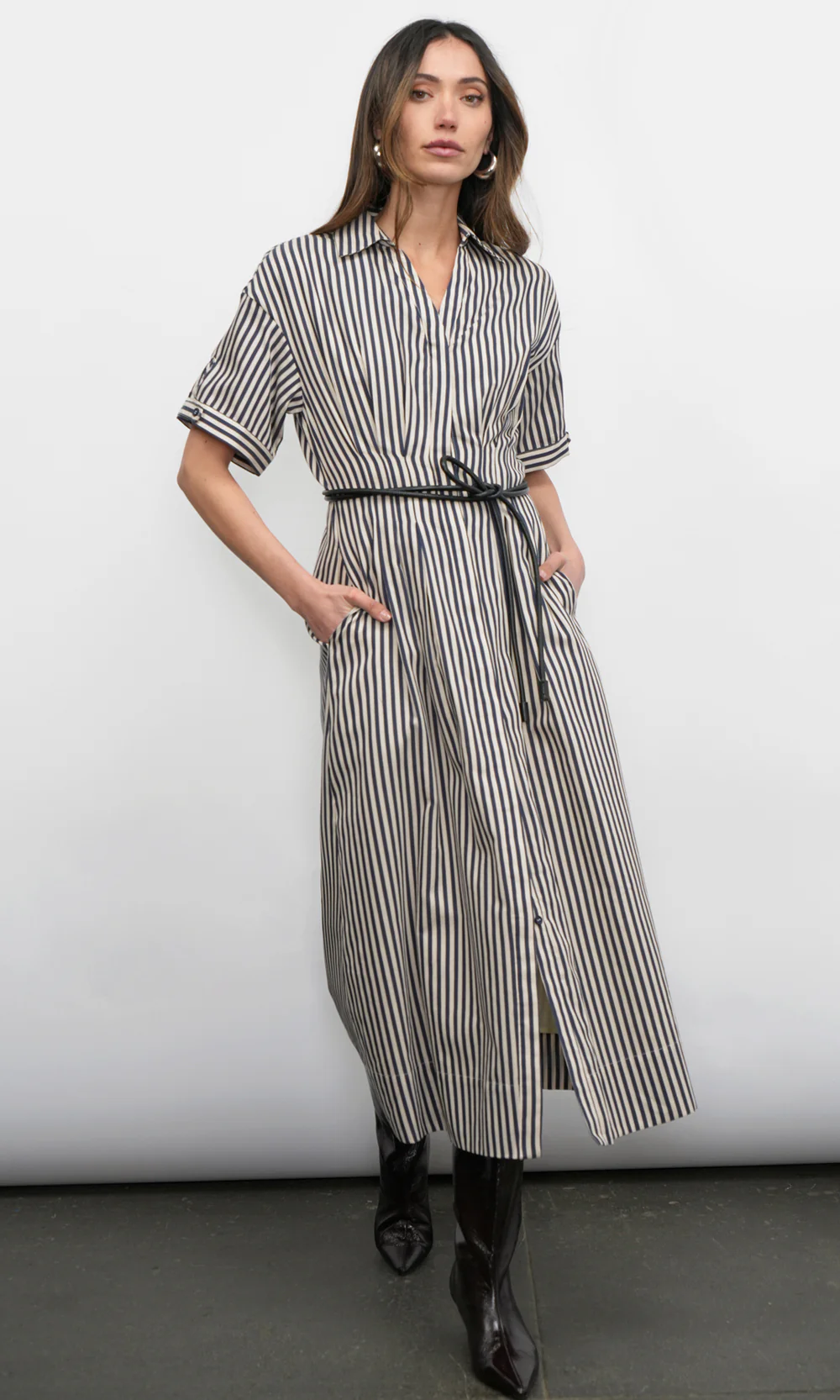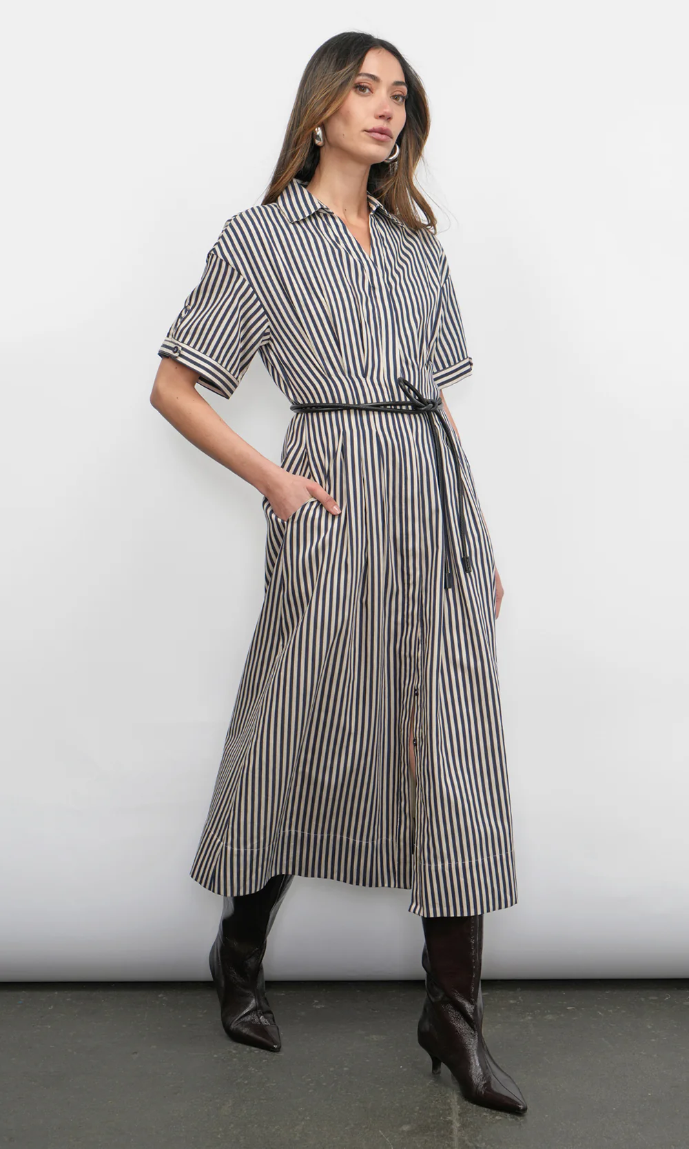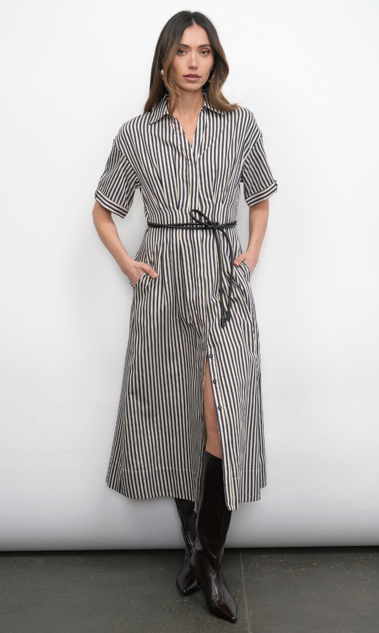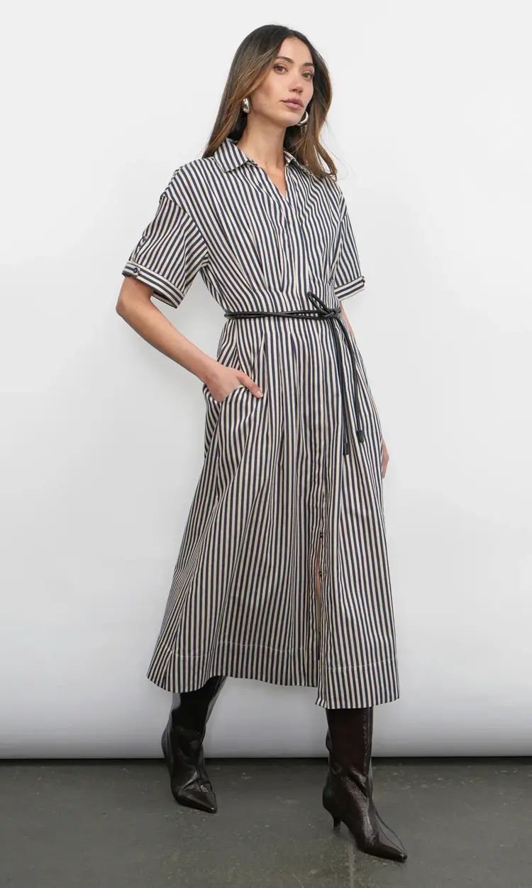 This elegant dress features timeless vertical stripes in a crisp color combination, offering a fresh and polished aesthetic. It is designed with a classic shirt collar, a full button-down front, and versatile long sleeves that can be styled up or down.