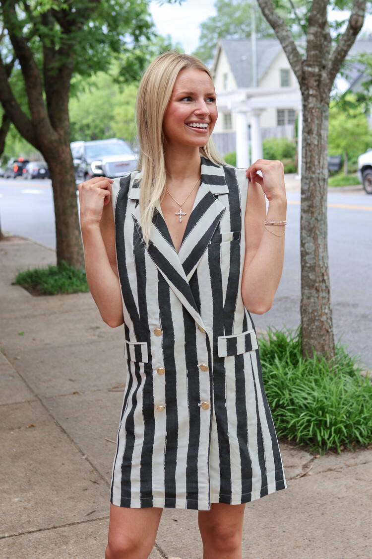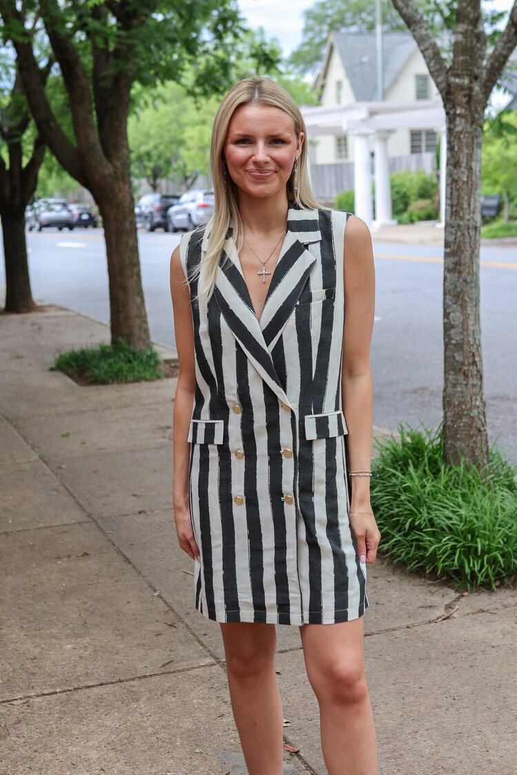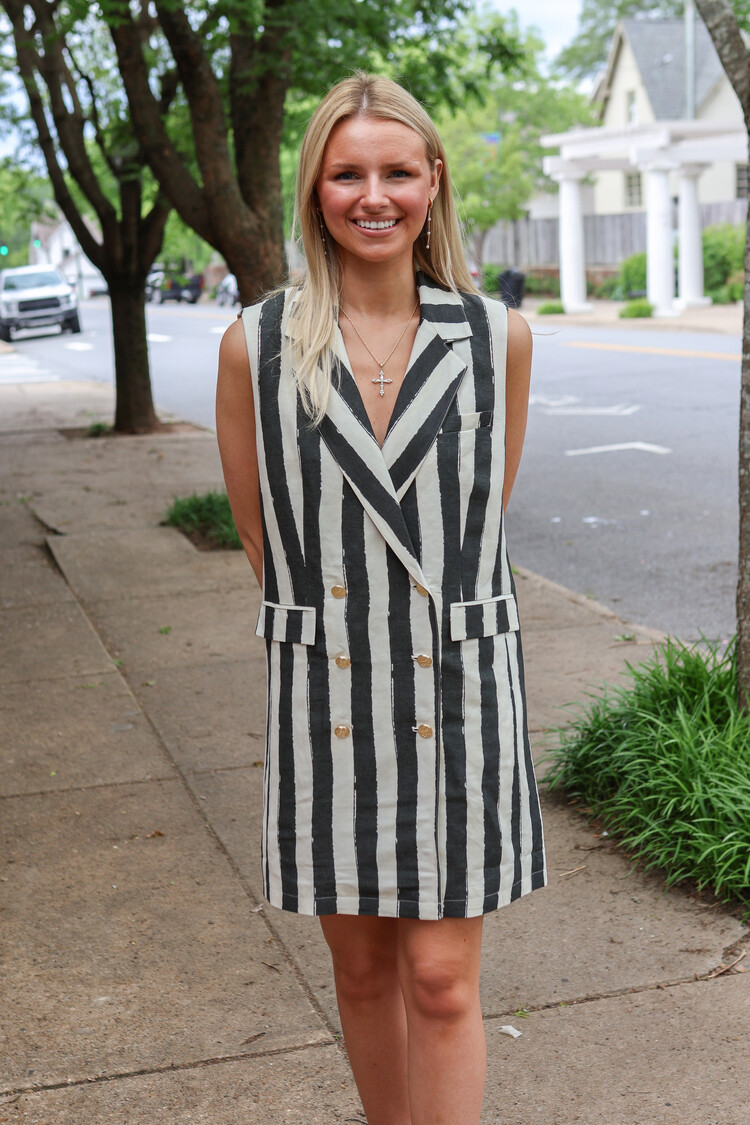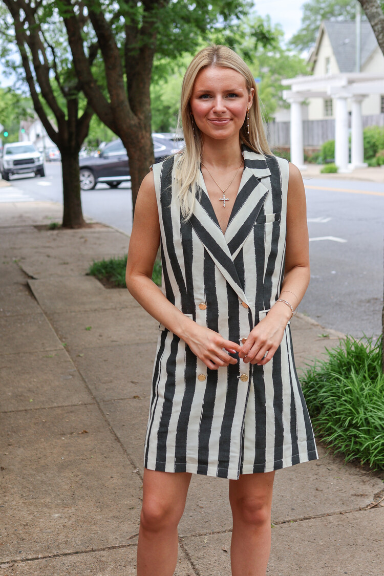 A modern take on the classic blazer dress, the Veronica Dress in Stripe Noir features a sharp lapel collar, double-breasted button closure, and a clean, tailored fit. Structured, stylish, and effortlessly polished with its luxurious linen fabric.