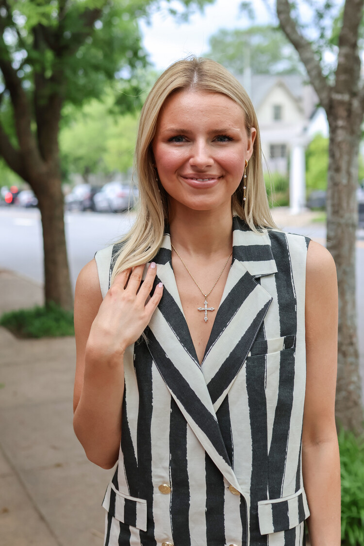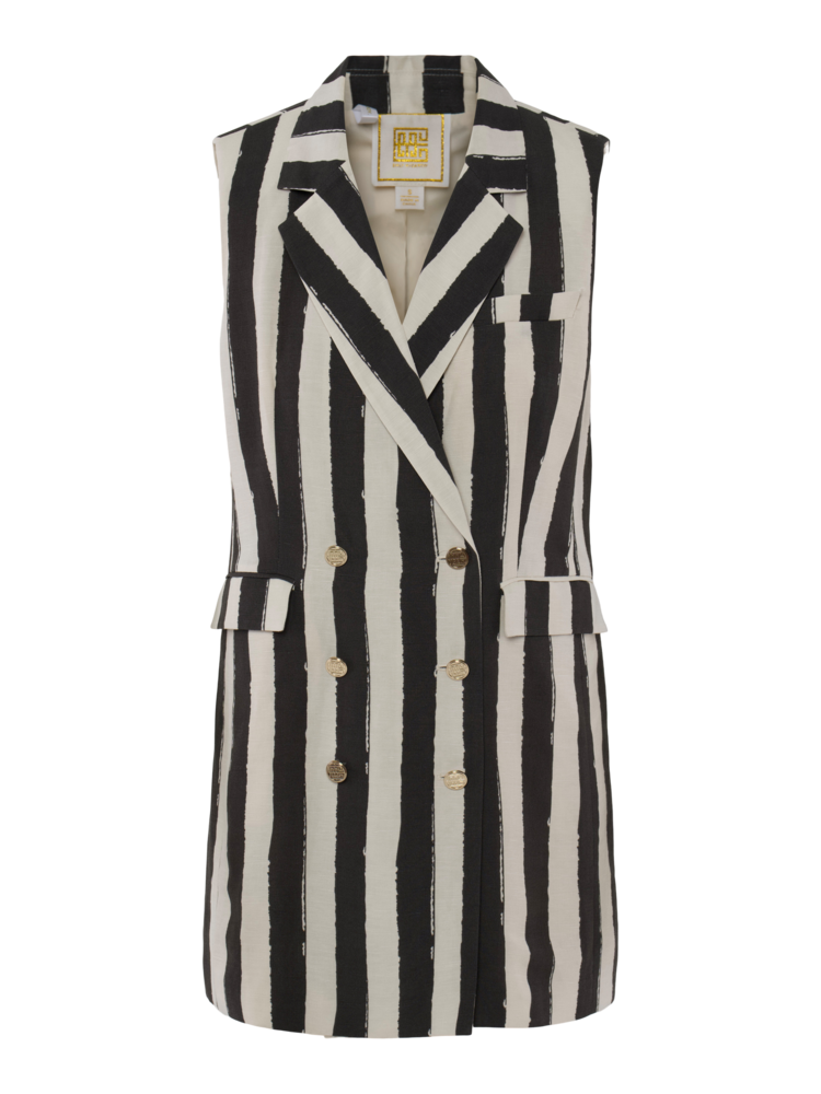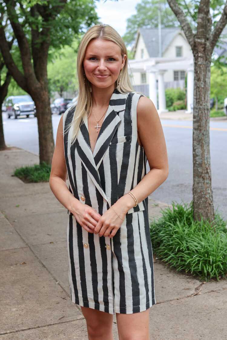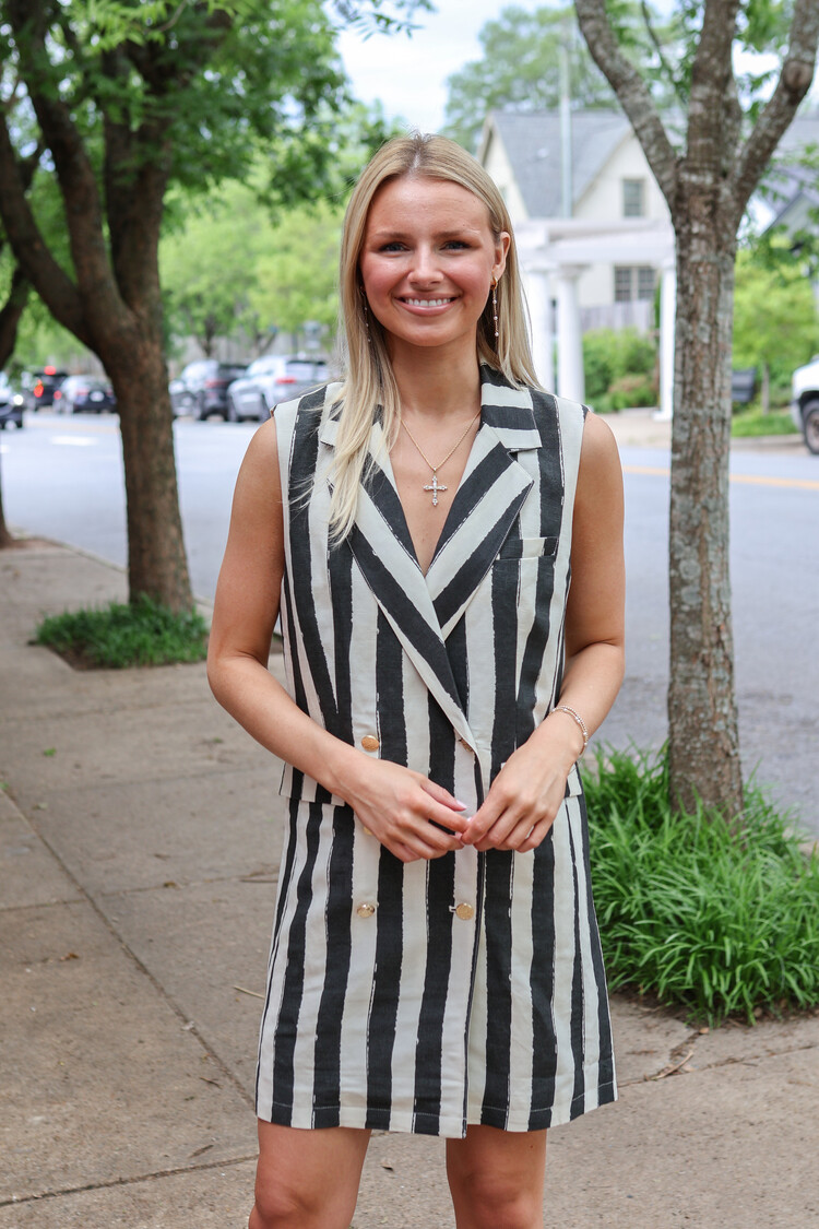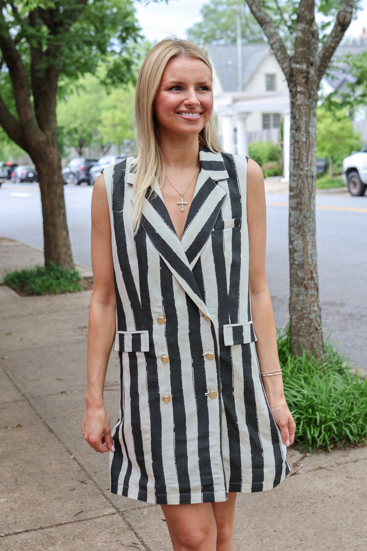 A modern take on the classic blazer dress, the Veronica Dress in Stripe Noir features a sharp lapel collar, double-breasted button closure, and a clean, tailored fit. Structured, stylish, and effortlessly polished with its luxurious linen fabric.