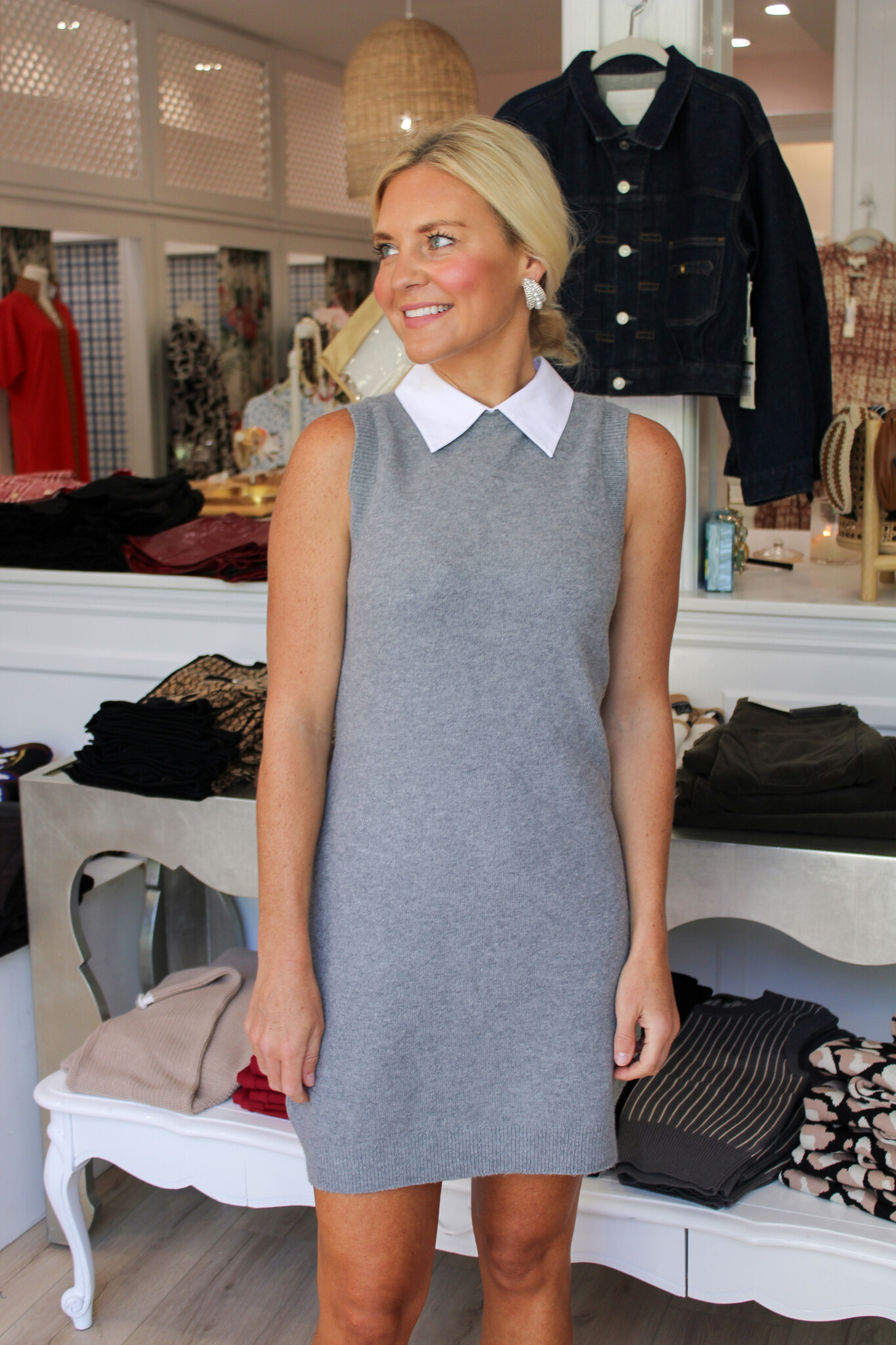 • The Vhari Knit Dress makes getting dressed feel effortless. Crafted from a plush grey melange knit, it features a built-in shirt collar for a layered look. The relaxed fit keeps things comfortable, whether you're heading into the office or off the clock.